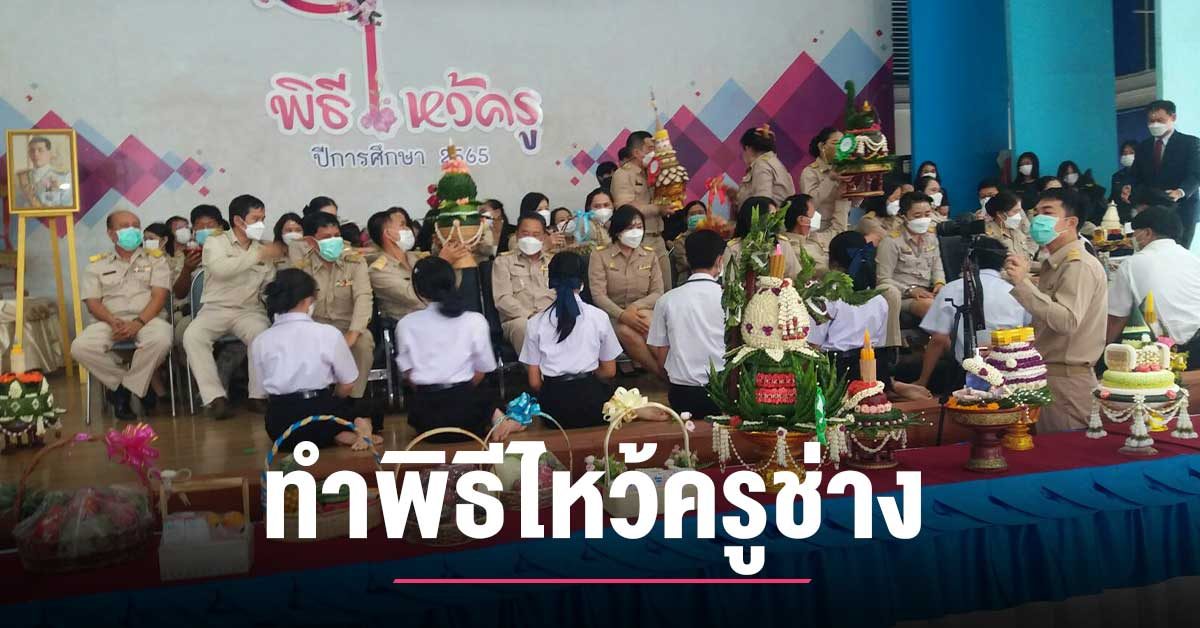 และต่อด้วยพิธีไหว้ครู ของนักเรียน นักศึกษา ทุกแผนกของวิทยาลัยอาชีวศึกษาจำนวน 1,800 คน โดยมีตัวแทนนักเรียน ฯ กล่าวคำบูชาครู นายโอภาส ปัญญาพฤษ์ ผู้อำนวยการ ฯ และคณะครู รับพานไหว้ครูจากตัวแทนนักเรียน นักศึกษา ซึ่งในปีนี้การจัดทำพานไหว้ครู แต่ละชั้นเรียน จะทำพานพุ่ม และพานกระเช้าผลไม้ หรือสิ่งของบำรุงสุขภาพ เพื่อจะได้นำไปมอบเป็นกำลังใจ ให้ผู้ป่วยตามโรงพยาบาล และโรงเรียนที่มีนักเรียนพิการ เพื่อสร้างกุศล ในการช่วยเหลือสังคมต่อไป