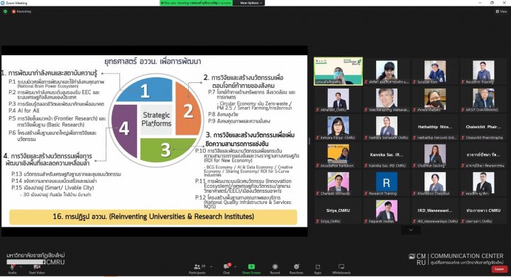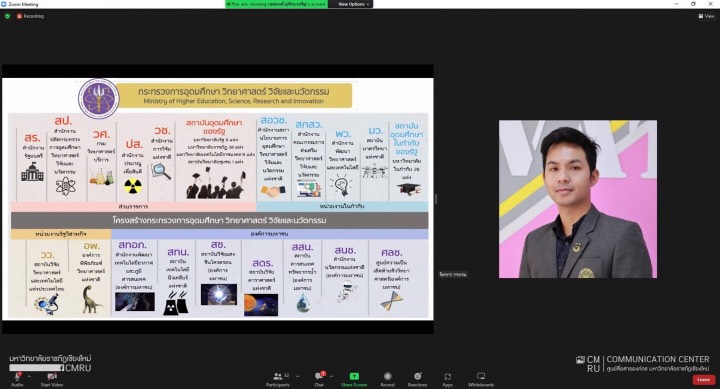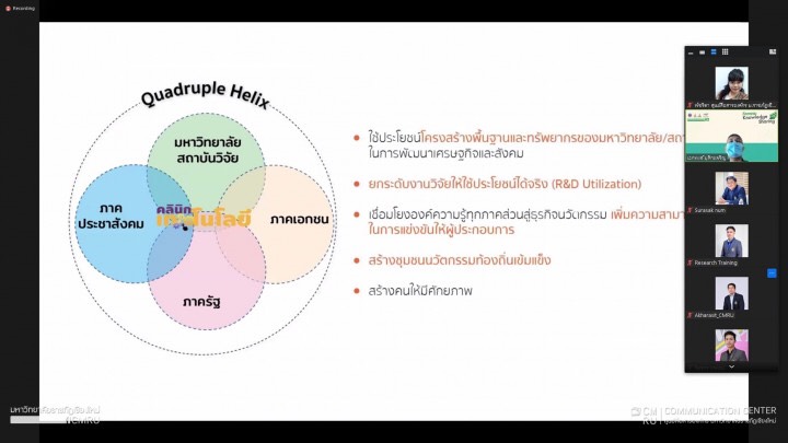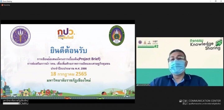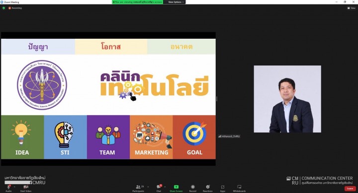 เมื่อวันที่ 18 กรกฎาคม 2565 รศ.ดร.วัชรพงษ์ วัฒนกูล รองอธิการบดี มหาวิทยาลัยราชภัฏเชียงใหม่ เป็นประธานกล่าวเปิดการอบรมเชิงปฏิบัติการ “การพัฒนาข้อเสนอโครงการเพื่อขอทุนภายใต้คลินิกเทคโนโลยีปีงบประมาณ 2566” ในรูปแบบออนไลน์ผ่านโปรแกรม Zoom cloud Meeting ซึ่งจัดโดย สถาบันวิจัยและพัฒนา ตามที่ มหาวิทยาลัยราชภัฏเชียงใหม่ ได้รับการตอบรับ เป็นเครือข่ายถ่ายทอดเทคโนโลยี “คลินิกเทคโนโลยี” เพื่อเสริมศักยภาพการดำเนินงานด้านวิทยาศาสตร์ เทคโนโลยีและนวัตกรรม ในพื้นที่จังหวัดเชียงใหม่ และพื้นที่จังหวัดใกล้เคียง เป็นศูนย์กลางการให้คำปรึกษาและข้อมูลเทคโนโลยีและนวัตกรรม ส่งเสริมให้นักวิจัย อาจารย์และบุคลากรมีความรู้ความเข้าใจเกี่ยวกับแนวทางการดำเนินงานโครงการส่งเสริม การนำ วิทยาศาสตร์ เทคโนโลยีและนวัตกรรม เพิ่มศักยภาพการผลิตและเศรษฐกิจชุมชน ประจำปีงบประมาณ พ.ศ. 2566 พัฒนาและเพิ่มประสิทธิภาพในการเขียนข้อเสนอโครงการเพื่อขอทุนคลินิกเทคโนโลยี ภายใต้คลินิกเทคโนโลยี 4 แพลตฟอร์ม ได้แก่ แพลตฟอร์มบริการให้คำปรึกษาและข้อมูลเทคโนโลยี (TCS) แพลตฟอร์มพัฒนาขีดความสามารถเครือข่าย (NCB) แพลตฟอร์มเพิ่มศักยภาพธุรกิจชุมชน (BCE) และแพลตฟอร์มบ่มเพาะหมูบ้านวิทยาศาสตร์ (SCI) เปิดโอกาสให้มีการแลกเปลี่ยนเรียนรู้การนำความรู้ทางด้านวิทยาศาสตร์ เทคโนโลยีและนวัตกรรม เพื่อพัฒนาข้อเสนอโครงการ ซึ่งได้รับเกียรติจาก คุณเอกพงศ์ มุสิกะเจริญ นักวิเคราะห์นโยบายและแผนชำนาญการพิเศษ ผู้อำนวยการกลุ่มส่งเสริมธุรกิจเทคโนโลยีและนวัตกรรม (ธท.) กองส่งเสริมและประสานเพื่อประโยชน์ทางวิทยาศาสตร์ วิจัยและนวัตกรรม (กปว.) สำนักงานปลัดกระทรวงการอุดมศึกษา วิทยาศาสตร์ วิจัยและนวัตกรรม (สป.อว.) เป็นวิทยากร บรรยายให้ความรู้แก่ผู้บริหาร คณาจารย์ บุคลากร ผู้ร่วมการอบรม จำนวน 38 คน