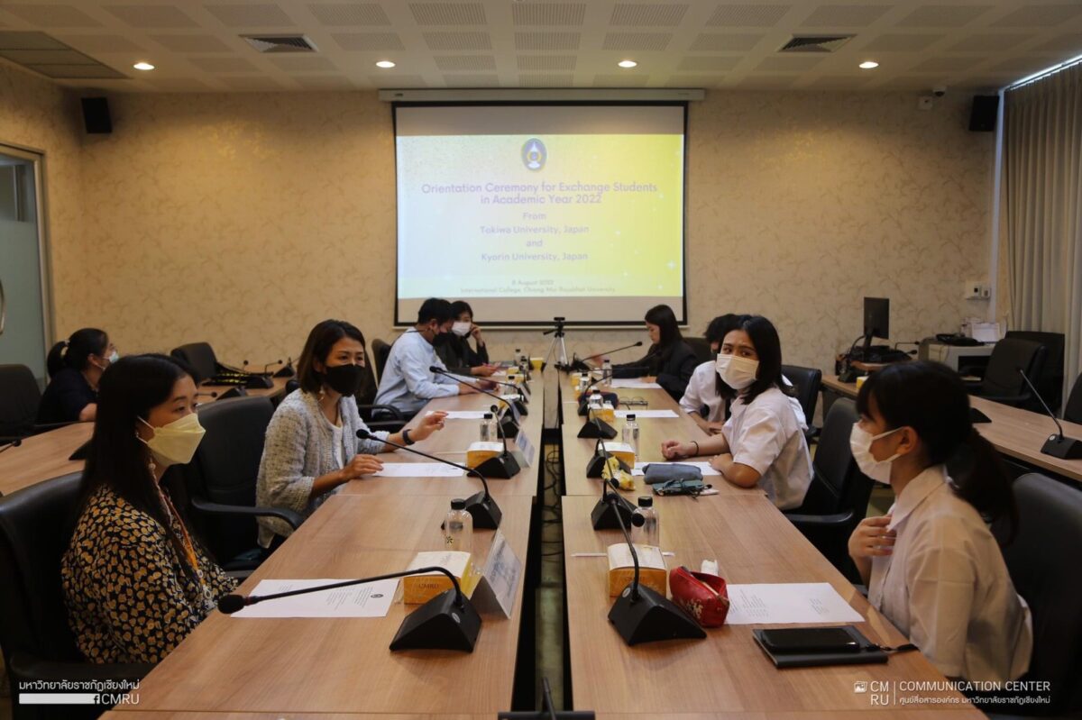 เมื่อวันที่ 8 สิงหาคม 2565 อ.กมลวัน สังสีแก้ว รองคณบดีฝ่ายวิชาการ วิทยาลัยนานาชาติ มหาวิทยาลัยราชภัฏเชียงใหม่ พร้อมด้วย ผศ.ดร.ดุษฎี รังษีชัชวาล ผู้อำนวยการสำนักงานวิเทศสัมพันธ์ มหาวิทยาลัยราชภัฏเชียงใหม่ คณะอาจารย์ บุคลากร วิทยาลัยนานาชาติ และสำนักงานวิเทศสัมพันธ์ ร่วมต้อนรับนักศึกษา ณ ห้องประชุม 2 วิทยาลัยนานาชาติ มหาวิทยาลัยราชภัฏเชียงใหม่ อาคาร 90 ปี ราชภัฏเชียงใหม่ ในการปฐมนิเทศนักศึกษาโครงการแลกเปลี่ยน ประจำปีการศึกษา 2565 จากประเทศญี่ปุ่น ได้แก่ Miss Chiho Maeshima จาก Tokiwa University, Miss Tamaki Naoi และ Mr.Haruaki Ito จาก Kyorin University เพื่อเป็นการเตรียมความพร้อมให้กับนักศึกษาก่อนเข้าชั้นเรียน ให้คำแนะนำด้านการเรียนการสอน และแนะนำข้อมูลสำคัญที่จำเป็นต่อการดำเนินชีวิตทั้งในรั้วมหาวิทยาลัยและในจังหวัดเชียงใหม่