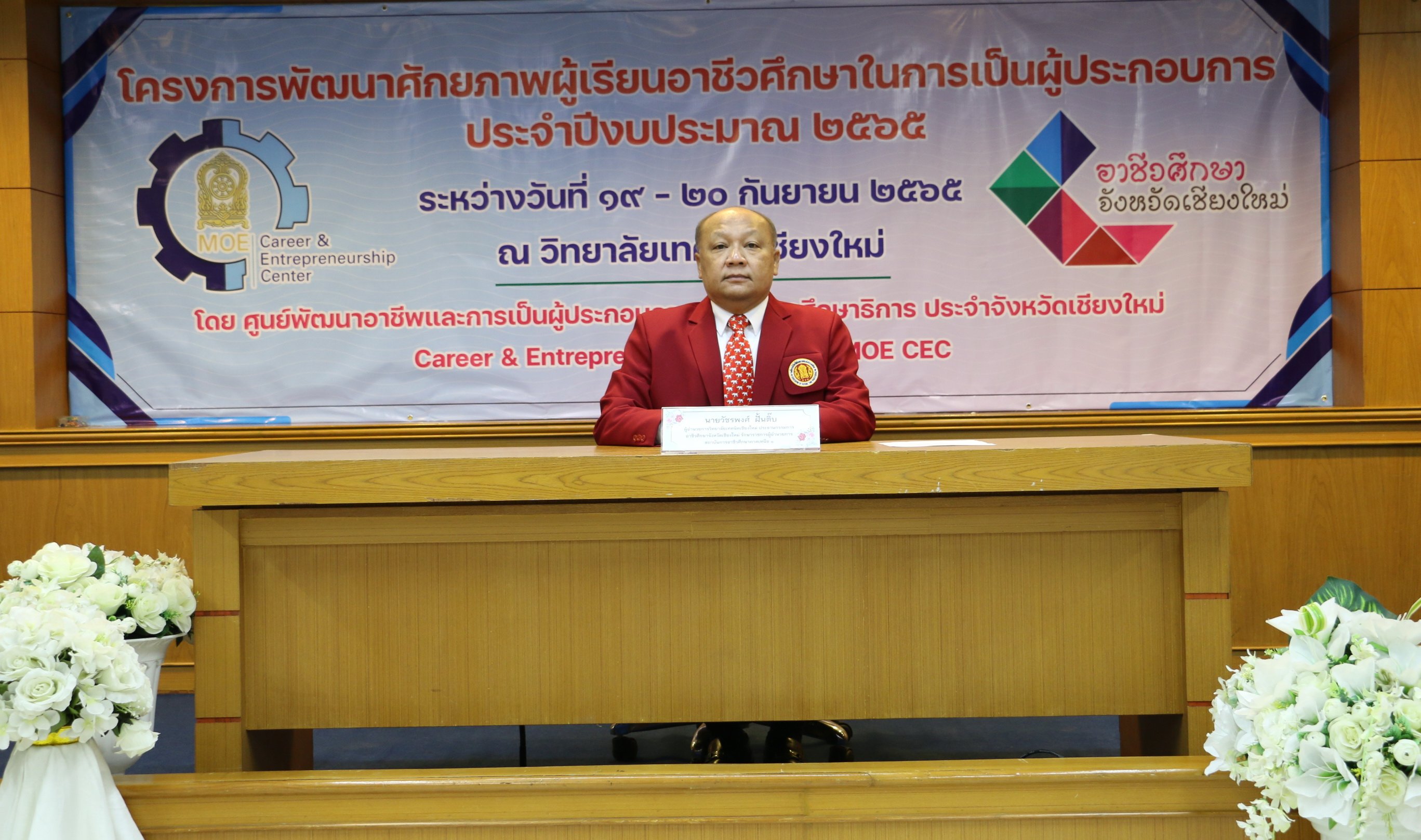 วันที่ 19 กันยายน 2565 นายวัชรพงศ์ ฝั้นติ๊บ ผู้อำนวยการวิทยาลัยเทคนิคเชียงใหม่ ประธานกรรมการอาชีวศึกษาจังหวัดเชียงใหม่ รักษาการผู้อำนวยการอาชีวศึกษาภาคเหนือ 1 เป็นประธานกล่าวเปิดโครงการพัฒนาศักยภาพผู้เรียนอาชีวศึกษา ในการเป็นผู้ประกอบการ ประจำปีงบประมาณ 2565 ระหว่างวันที่ 19 – 20 กันยายน 2565 จัดโดยศูนย์พัฒนาอาชีพและการเป็นผู้ประกอบการกระทรวงศึกษาธิการ ประจำจังหวัดเชียงใหม่ MOE:CEC ณ วิทยาลัยเทคนิคเชียงใหม่ โดยมีหลักสูตรอบรมและวิทยากร ดังนี้