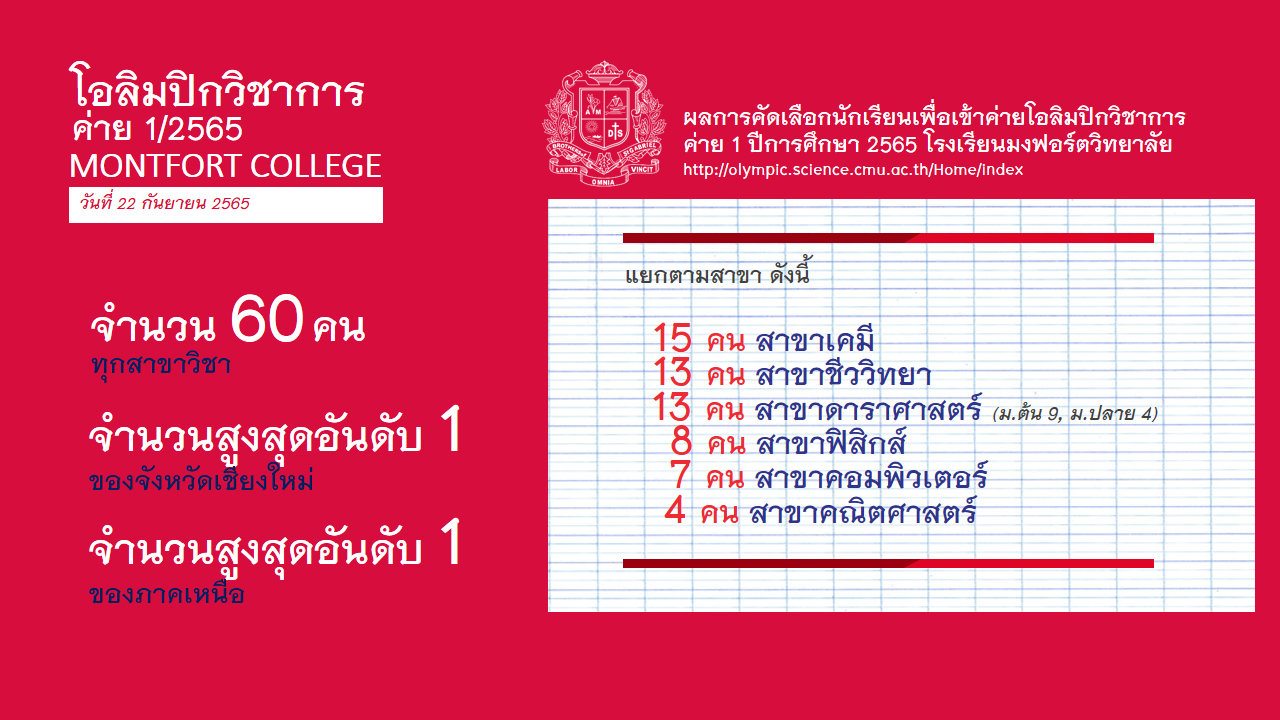ขอแสดงความยินดีกับนักเรียนโรงเรียนมงฟอร์ตวิทยาลัย จำนวน 60 คน ที่่ผ่านการคัดเลือกเพื่อเข้าค่ายโอลิมปิกวิชาการ ค่าย 1 ประจำปีการศึกษา 2565