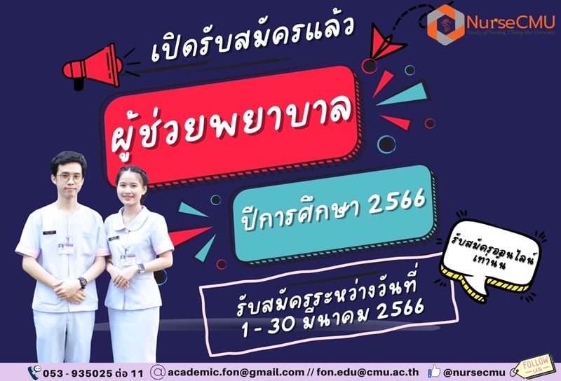 คณะพยาบาลศาสตร์ มช. รับสมัครศึกษาต่อหลักสูตร”ประกาศ นียบัตรผู้ช่วยพยาบาล” (ภาคพิเศษ) ประจำปีการศึกษา 2566