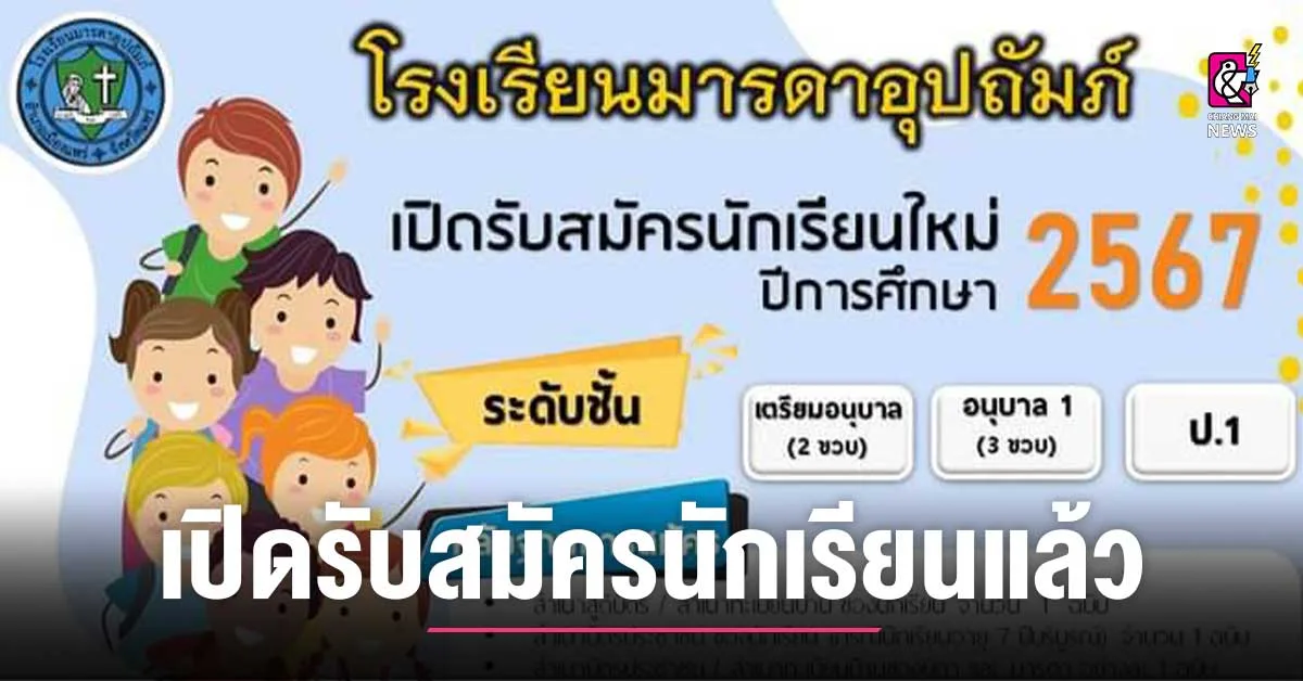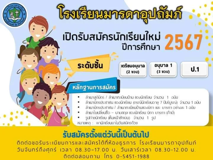 น.ส.สิรืกรานต์ เปี่ยมวุฒื ผอ.ร.ร.มารดาอุปุมภ์ อ.เมือง จ.แพร่ เผยว่า ร.ร.มารดาอุปถัมภ์ เปิดรับสมัครนักเรียนใหม่ ปีการศึกษา 2567 ระดับชั้นเตรียมอนุบาล อนุบาล 1(2 ขวบ) อนุบาล 3(3 ขวบ) และชั้น ป.