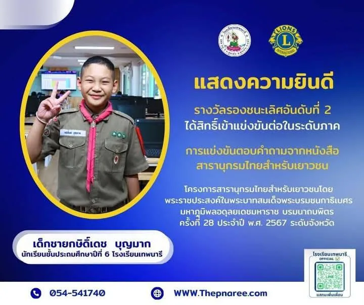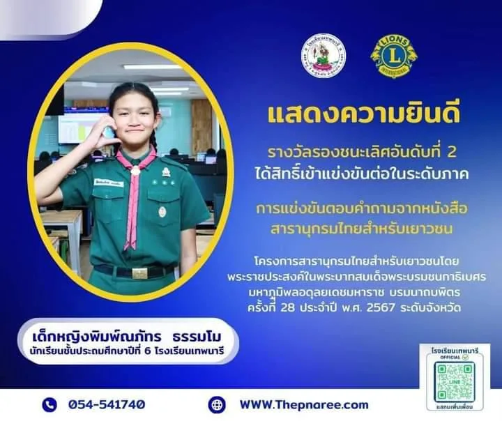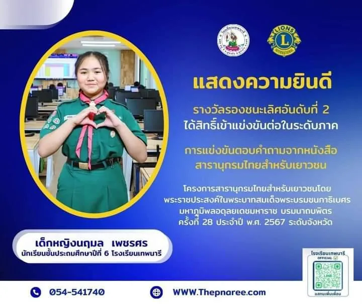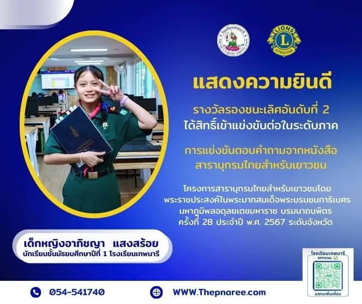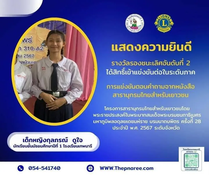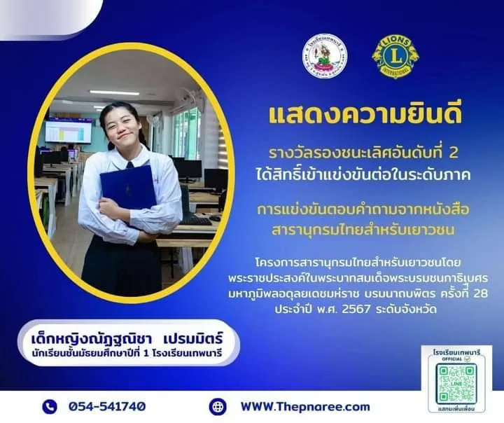 นางสุกานดา พันธุ์นิติพงศ์ ผู้อำนวยการโรงเรียนเทพนารี อ.สูงเม่น จ.แพร่ พร้อมคณะครูนักเรียนขอแสดงความยินดีกับนักเรียน ระดับประถมศึกษาตอนปลาย และระดับมัธยมศึกษาตอนต้น ในการแข่งขันตอบคำถามสารานุกรมไทย ครั้งที่ 28 ระดับจังหวัด โดยได้รางวัลรองชนะเลิศอันดับ 2 โดยได้รับสิทธิ์เป็นตัวแทนของจังหวัด เพื่อเข้าร่วมการแข่งขันในระดับภาคต่อไป