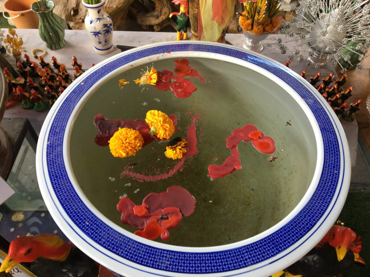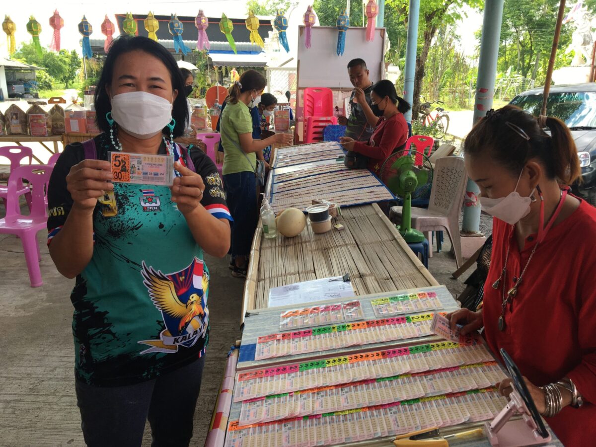 ในส่วนพิธีบวงสรวง ทางอาจารย์ศักดิ์ชัย วงษ์หล้า แห่งบ้านโหรอัสสโต นำประกอบพิธีบวงสรวง ให้ประชาชนที่ร่วมพิธีจุดธูปบูชาบวงสรวง และต่อเงินต่อทองเพื่อเป็นมงคล จากนั้นหลวงปู่ครูบาคำฝั้น จุดเทียนแดงอ่างน้ำมนต์ เพื่อให้โชคกับประชาชนที่มาร่วมพิธี ซึ่งหลังเสร็จวิ้นพิธี พบเลข 3, 5, อยู่ตรงกลางอ่างน้ำมนต์ชัดเจนมากที่สุด ส่วนเลข 7 และ 9 และ 8 มองไม่ชัดจะอยู่ข้างล่างเลข 35 จากนั้นผู้มาร่วมในพิธีไปซื้อลอตเตอรี่แผงที่ขายในวัดที่มีให้เลือกซื้ออยู่จำนวนมาก บางคนซื้อ 50 ละ 51 และ 10 เพราะ มองเลข 7 เป็น 1 และเลข 9 เป็นเลข 0 ก็แล้วแต่สายตาของแต่ละคนจะมองเห็นเป็นเลขอะไร ซึ่งพ่อค้าแม่ค้าลอตเตอรี่มีให้เลือกซื้อหลายใบชนิดที่ว่าแบกกันรวยทั่วหน้าได้เลยงวดนี้