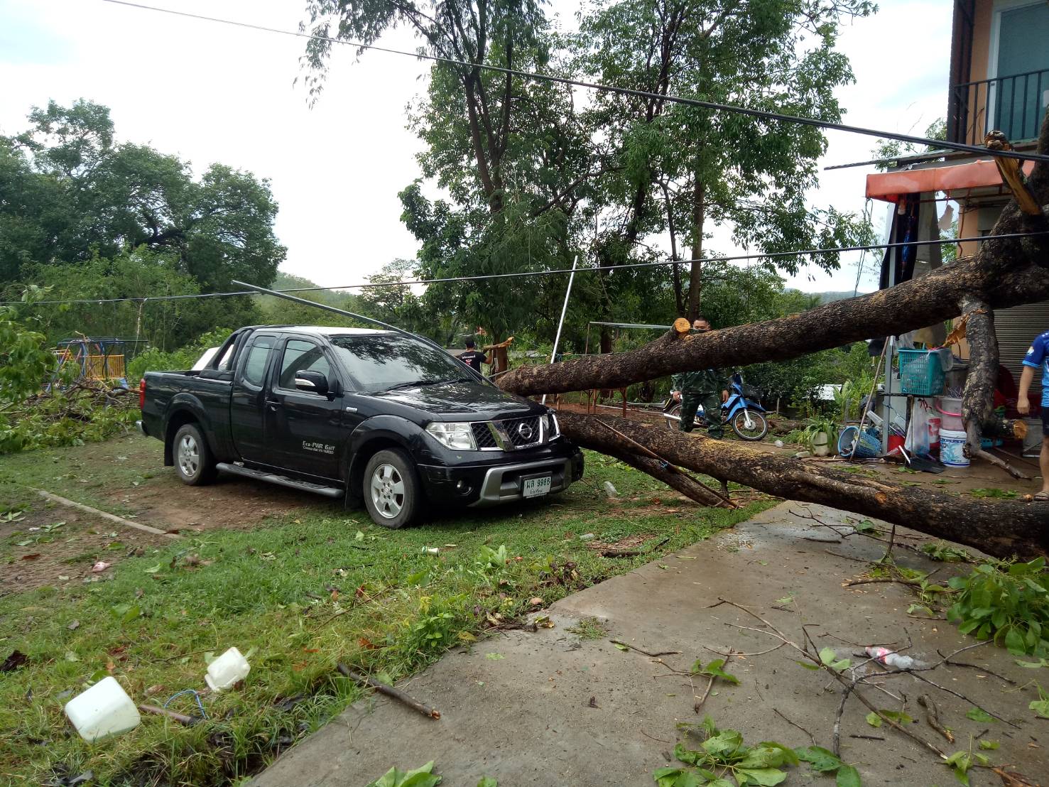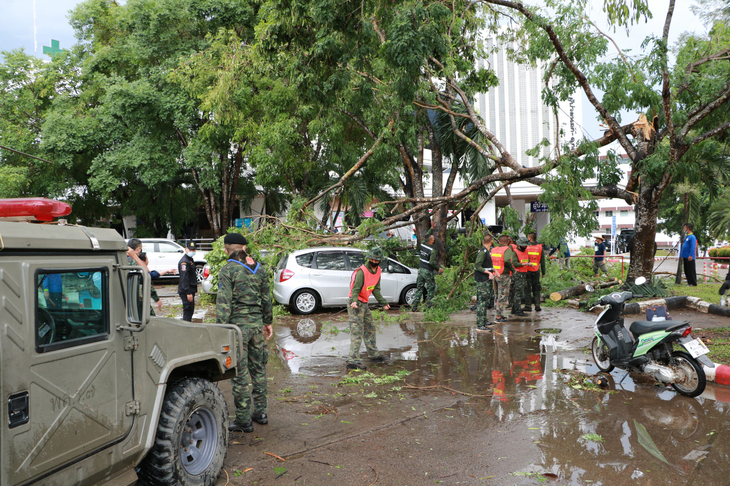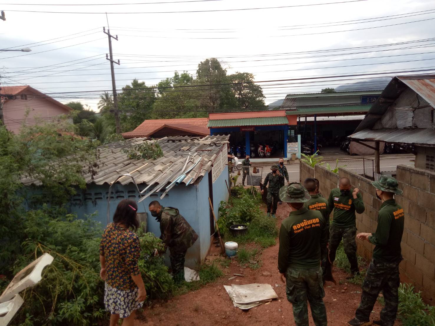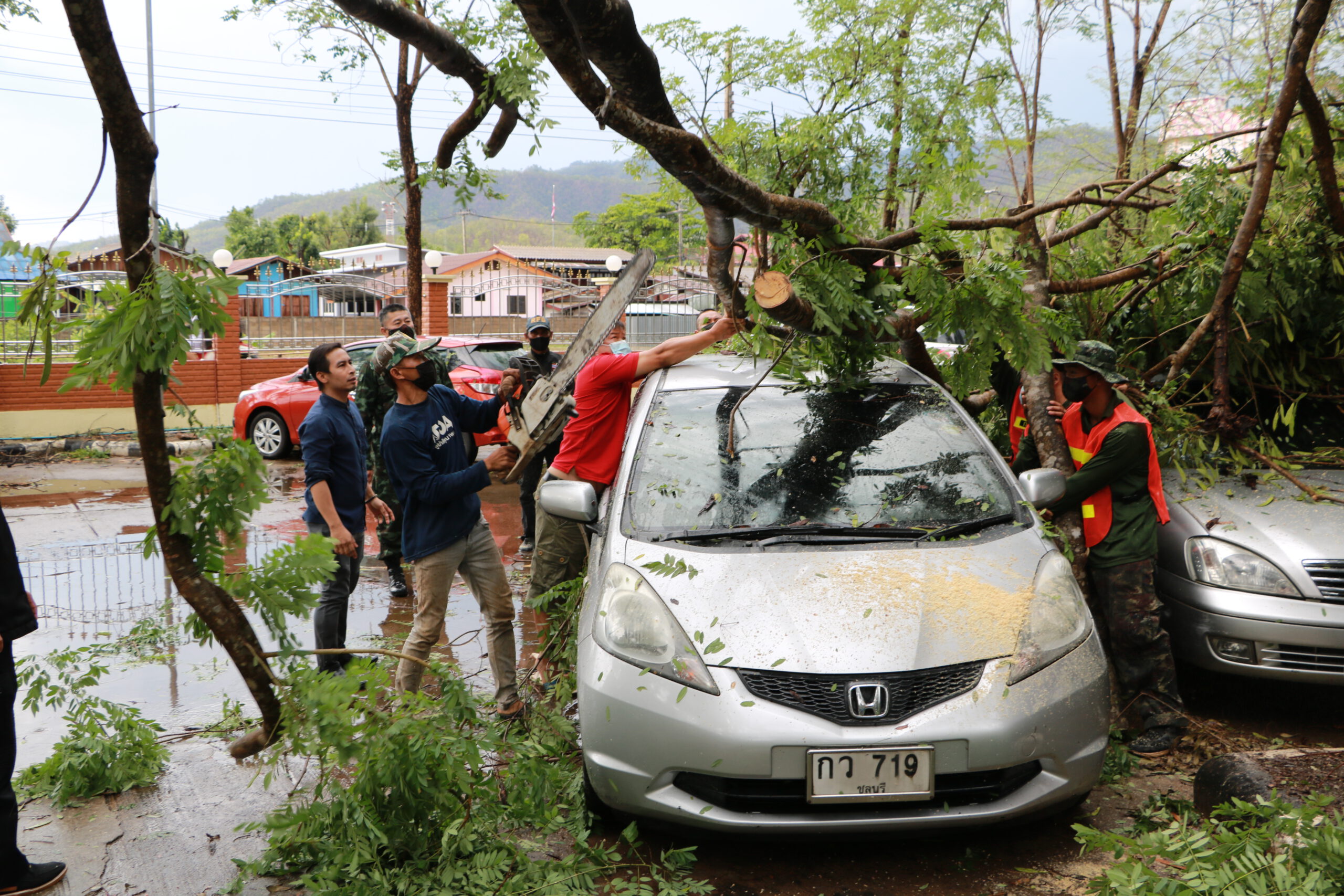 จากสถานการณ์ลมพายุและฝนตกหนักเมื่อวานที่ผ่านมา พ.อ.สุจินต์ ทรัพย์สิน ผบ.ฉก.ร.7 ได้ส่งกำลังเจ้าหน้าที่ทหาร จาก ฉก.ร.7 และ ร.อ.นิธินันท์ ทนันชัย ผบ.ร้อย.ร.721 เป็นผู้ควบคุม ร้อย.ร.721 ลงพื้นที่ให้การช่วยเหลือประชาชน ได้แก่ ให้ความช่วยเหลือ นางอารีย์ โชติเวทย์เมธากุล บ้านเลขที่ 10/4 ถ.ศิริมงคล ต.จองคำ อ.เมือง ฯ เนื่องจากต้นไม้ขนาดใหญ่หักโค่นทับ ทำให้รถยนต์เสียหาย จำนวน 2 คัน และได้ร่วมกับราษฎรในพื้นที่ ทำการตัดต้นไม้ที่หักโค่นเพื่อนำรถยนต์ออกจากพื้นที่ต่อไป พร้อมให้ความช่วยเหลือ นางสุวรรณมิต นามมะนู บ้านเลขที่ 7/24 ถ.ศิริมงคล ต.จองคำ อ.เมือง เนื่องจากถูกลมพายุพัดกระเบื้องชำรุดเสียหาย จำนวน 15 แผ่น จากนั้นทำการซ่อมแซมเบื้องต้น เพื่อสามารถพักอาศัยได้ต่อไป