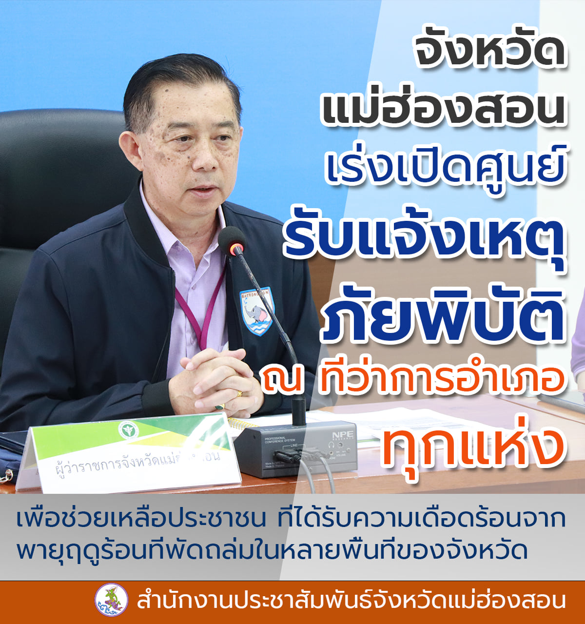นายสิธิชัย จินดาหลวง ผวจ.แม่ฮ่องสอน เปิดเผยว่า ทางจังหวัดได้เร่งให้ทุกอำเภอ เปิดศูนย์รับแจ้งเหตุภัยพิบัติในทุกอำเภอ เพื่อรวบรวมข้อมูล ในการเตรียมให้การช่วยเหลือผู้ประสบภัยทั้งจังหวัดในโอกาสต่อไป
