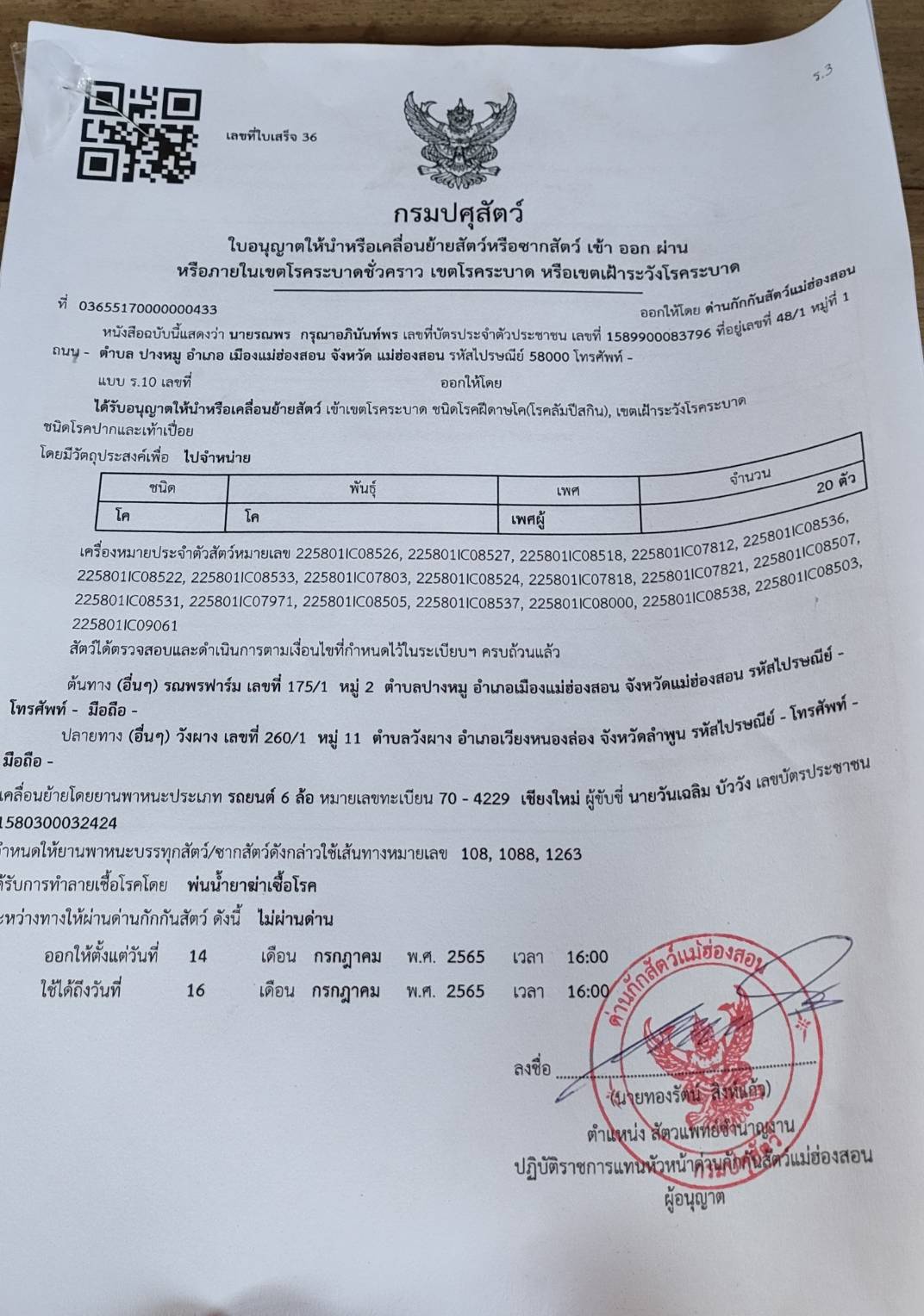 นายอุดม หมั่นศึกษา กำนันตำบลแม่เงา ฯ กล่าวต่อไปว่า ขอเรียนถามเจ้าหน้าที่ปศุสัตว์อำเภอขุนยวมว่าที่ผ่านมา เมื่อวันที่ 7 กรกฎาคม 2565 มีการประชุมร่วมกันเรื่องโรคระบาดปากเปื่อยเท้าเปื่อยใน โค กระบือ ในพื้นที่ตำบลแม่เงา และตำบลแม่กี๊ อ.ขุนยวม จ.แม่ฮ่องสอน ซึ่งเป็นเขตพื้นที่โรคระบาดอยู่ ซึ่งอาศัยอำนาจของท่านนายอำเภอเป็นผู้ประกาศห้ามนำเข้าสัตว์ แต่กลับมีรถบรรทุกเข้ามาขนโค จากสหภาพเมียนมาร์ ผ่านช่องทางจุดผ่อนปรนห้วยต้นนุ่น โดยพบว่า ผู้นำรถบรรทุกมาขนวัว ได้แสดงใบขออนุญาตขนเคลื่อนย้ายสัตว์ แต่เป็นที่น่าสังเกตว่า ในใบขออนุญาตดังกล่าว กลับระบุว่า ได้บรรทุกวัว ต้นทางมาจาก บ้านปางหมู ต.ปางหมู อ.เมือง จ.แม่ฮ่องสอน และ ปลายทางอยู่ที่ จังหวัดลำพูน แต่ทำไมถึงปล่อยโคออกจากด่านกักสัตว์บ้านหลวงหมู่ที่ 8 ตำบลแม่เงา อ.ขุนยวม ซึ่งไม่ตรงกับเอกสารใบขนย้ายสัตว์ที่นำมาแสดง