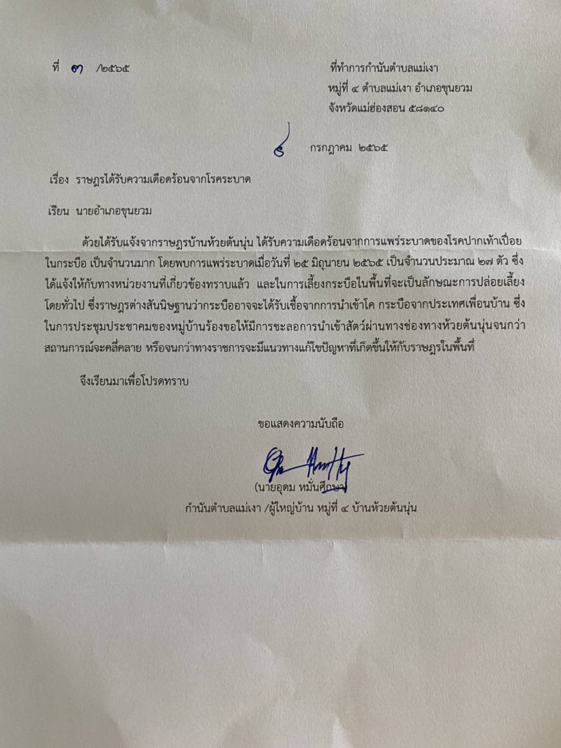 เมื่อวันที่ 16 กรกฎาคม 2565 นายอุดม หมั่นศึกษา กำนันตำบลแม่เงา อ.ขุนยวม จ.แม่ฮ่องสอน ร้องเรียนต่อผู้สื่อข่าวว่า ในพื้นที่ตำบลแม่เงา โดยเฉพาะช่องทางบ้านห้วยต้นนุ่น ต.แม่เงา อ.ขุนยวม ฯ ได้มีการนำเข้าสัตว์ ได้แก่โค และ กระบือ จากสหภาพเมียนมาร์ ผ่านเข้ามาที่ช่องทางดังกล่าว และส่งผลให้เกิดโรคปากเปื่อยเท้าเปื่อย ระบาดในหมู่บ้านต่าง ๆ ของตำบลแม่เงา และ ตำบลแม่กิ๊ โดยมีโคและกระบือของราษฎรไทยป่วยแล้ว จำนวน 27 ตัว ซึ่งทางราษฎรในพื้นที่ไม่เห็นด้วยในการนำเข้าสัตว์เพราะจะส่งผลให้เกิดโรคระบาดในไทย และมีการประชุมทำประชาคมไปแล้ว แต่ก็ยังมีการนำเข้าโคจากเมียนมาร์อย่างต่อเนื่อง