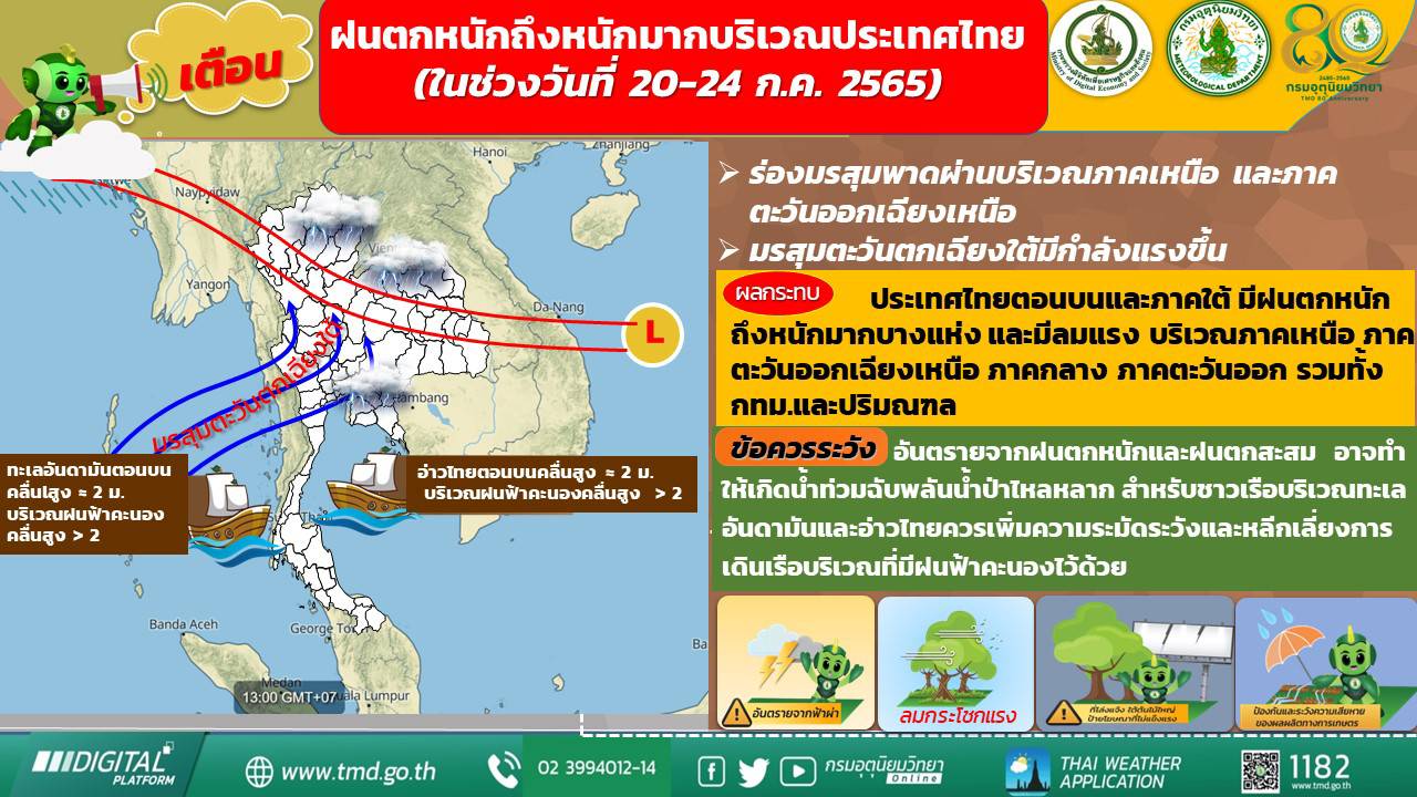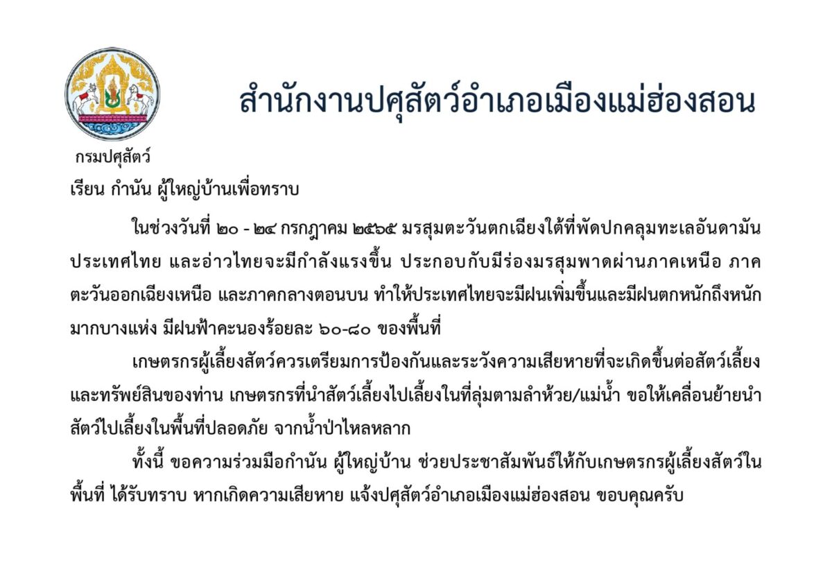 เนื่องด้วยในช่วงวันที่ 20-24 กรกฎาคม 2565 มรสุมตะวันตกเฉียงใต้ที่พัดปกคลุมทะเลอันดามันประเทศไทย และอ่าวไทยจะมีกำลังแรงขึ้น ประกอบกับมีร่องมรสุมพาดผ่านภาคเหนือ ภาคตะวันออกเฉียงเหนือ และภาคกลางตอนบน ทำให้ประเทศไทยจะมีฝนเพิ่มขึ้นและมีฝนตกหนักถึงหนักมากบางแห่ง มีฝนฟ้าคะนองร้อยละ 60-80 ของพื้นที่ จึงขอเตือนให้ เกษตรกรผู้เลี้ยงสัตว์ควรเตรียมการป้องกันและระวังความเสียหายที่จะเกิดขึ้นต่อสัตว์เลี้ยง และทรัพย์สินของท่าน เกษตรกรที่นำสัตว์เลี้ยงไปเลี้ยงในที่ลุ่มตามลำห้วย/แม่น้ำ ขอให้เคลื่อนย้ายนำสัตว์ไปเลี้ยงในพื้นที่ปลอดภัย จากน้ำป่าไหลหลากทั้งนี้ ขอความร่วมมือกำนัน ผู้ใหญ่บ้าน ช่วยประชาสัมพันธ์ให้กับเกษตรกรผู้เลี้ยงสัตว์ในพื้นที่ ได้รับทราบ หากเกิดความเสียหาย ให้รีบแจ้งต่อ ปศุสัตว์อำเภอเมืองแม่ฮ่องสอนเป็นการด่วน