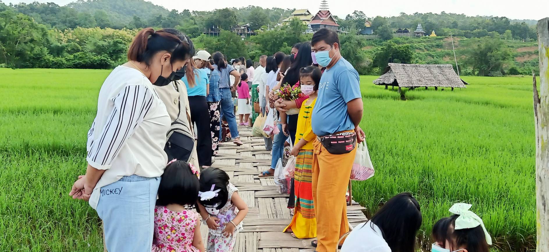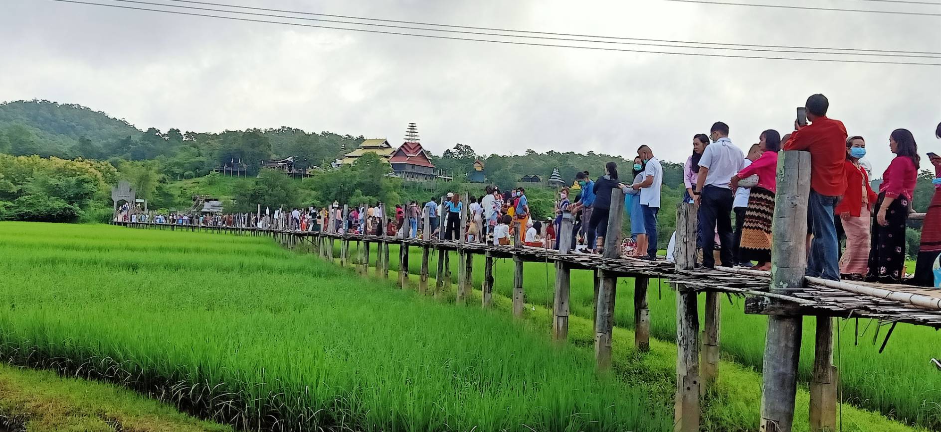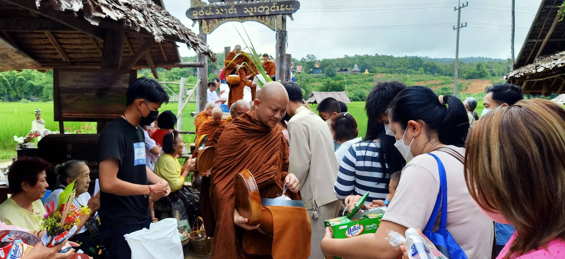 เมื่อวันที่ 11 ตุลาคม 2565 เวลา 07.30 น. พระปลัดจิตพัฒน์ อัคคปัญโญ เจ้าอาวาสวัดภูสมะณาราม บ้านกุงไม้สัก ต.ปางหมู อ.เมืองแม่ฮ่องสอน จัดให้มีพิธีทำบุญตักบาตรข้าวสารอาหารแห้ง เนื่องในเทศกาลออกพรรษาขึ้นบนสะพานซูตองเป้ หรือสะพานบุญอธิฐานแห่งความสำเร็จ ซึ่งเป็นแหล่งท่องเที่ยวยอดนิยมของจังหวัดแม่ฮ่องสอน โดยมีพุทธศาสนิกชนชาว ต.ปางหมู และหมู่บ้านในเขต อ.เมืองแม่ฮ่องสอน รวมถึงนักท่องเที่ยวแต่งกายชุดพื้นเมือง นำสิ่งของซึ่งส่วนใหญ่เป็นจำพวกอาหารสำเร็จรูปไปร่วมทำบุญใส่บาตรพระภิกษุสงฆ์ – สามเณรจำนวน 35 รูป ที่รับบิณฑบาตรไปตามสะพานซุตองเป้ ซึ่งเป็นสะพานไม้ไผ่ทอดข้ามทุ่งนาจากวัดภูสมะณารามไปยังบ้านกุงไม้สัก ตลอดแนวความยาวประมาณ 500 เมตร ท่ามกลางอากาศที่เย็นสบาย ปราศจากสายฝน ทั้งที่ก่อนหน้านี้มีฝนตกติดต่อกันหลายวันจนน้ำท่วมขังบริเวณสะพานซูตองเป้