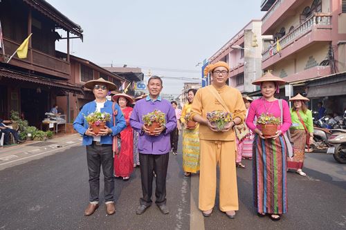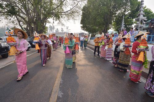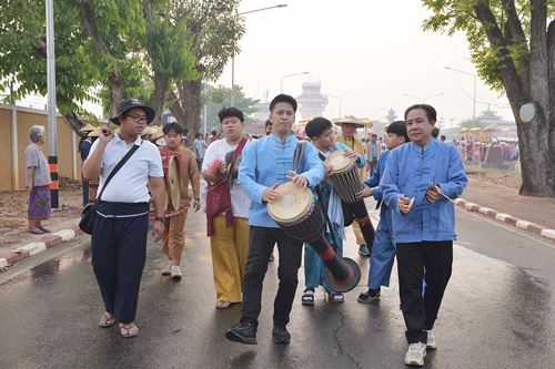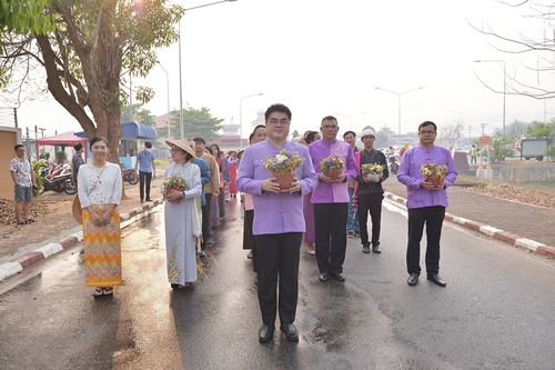 เริ่มด้วยผู้อาวุโสแต่งชุดขาว อุ้มขันข้าวตอกดอกไม้ซึ่งถือว่าเป็นผู้มีศีลธรรม เป็นผู้บริสุทธิ์เดินนำหน้าขบวน