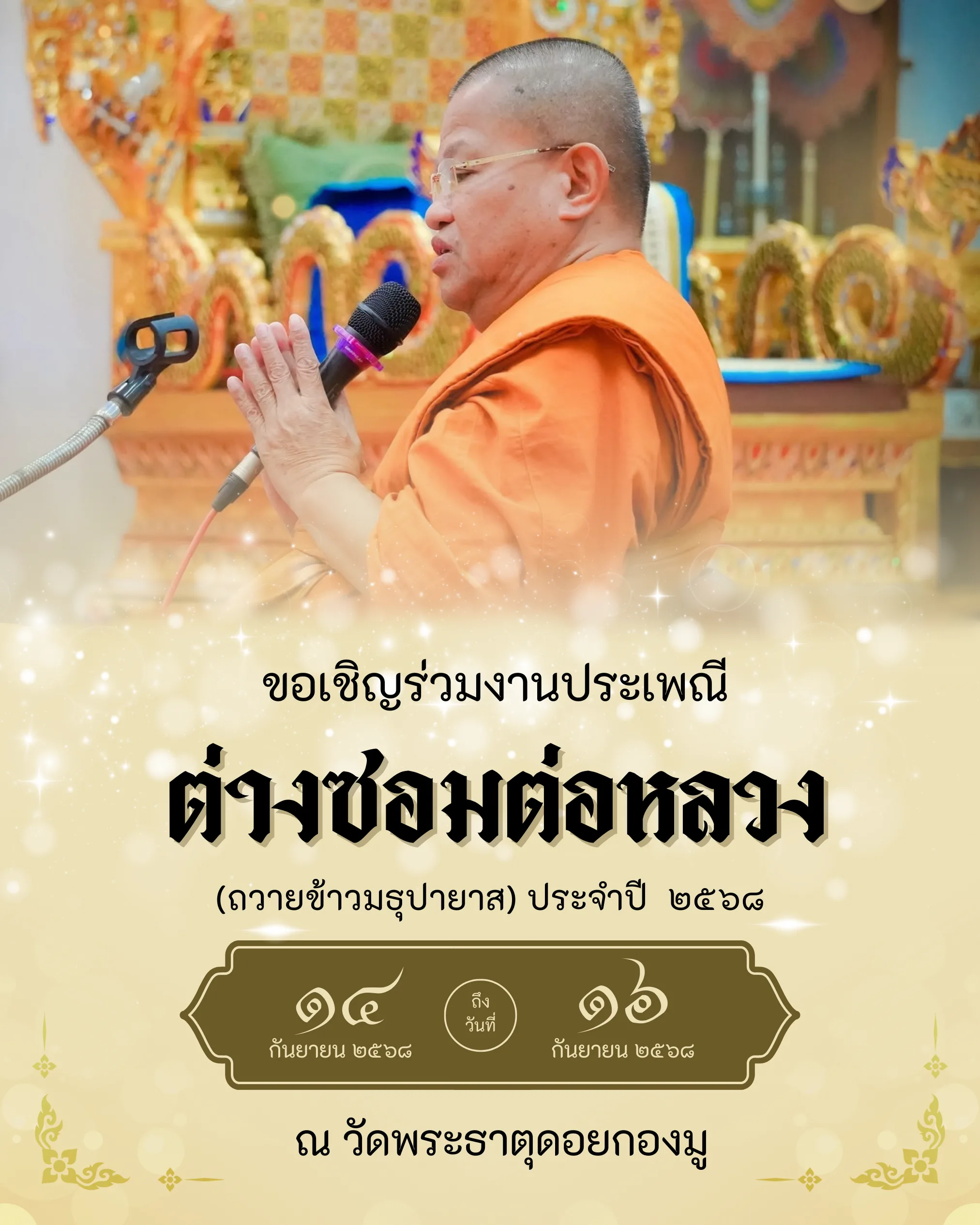 ขอเชิญร่วมงานประเพณีต่างซอมต่อหลวง (ถวายข้าวมธุปายาส) ประจำปี 2568 ณ วัดพระธาตุดอยกองมู ระหว่างวันที่ 14-16 กันยายน 2568 นี้