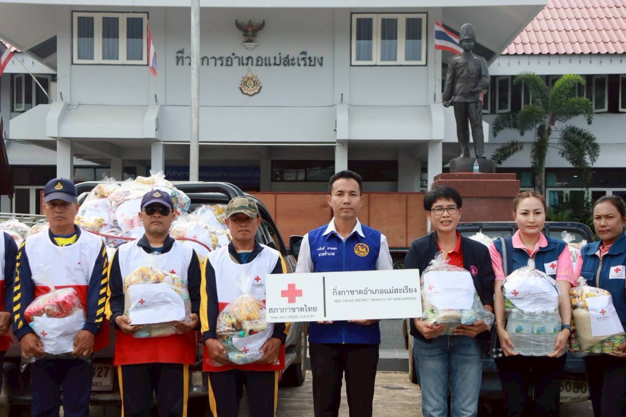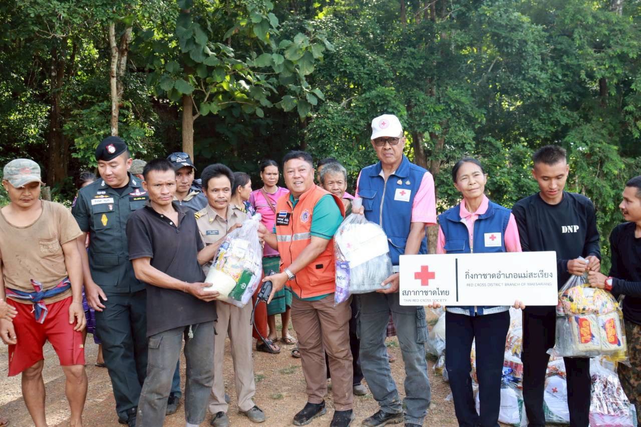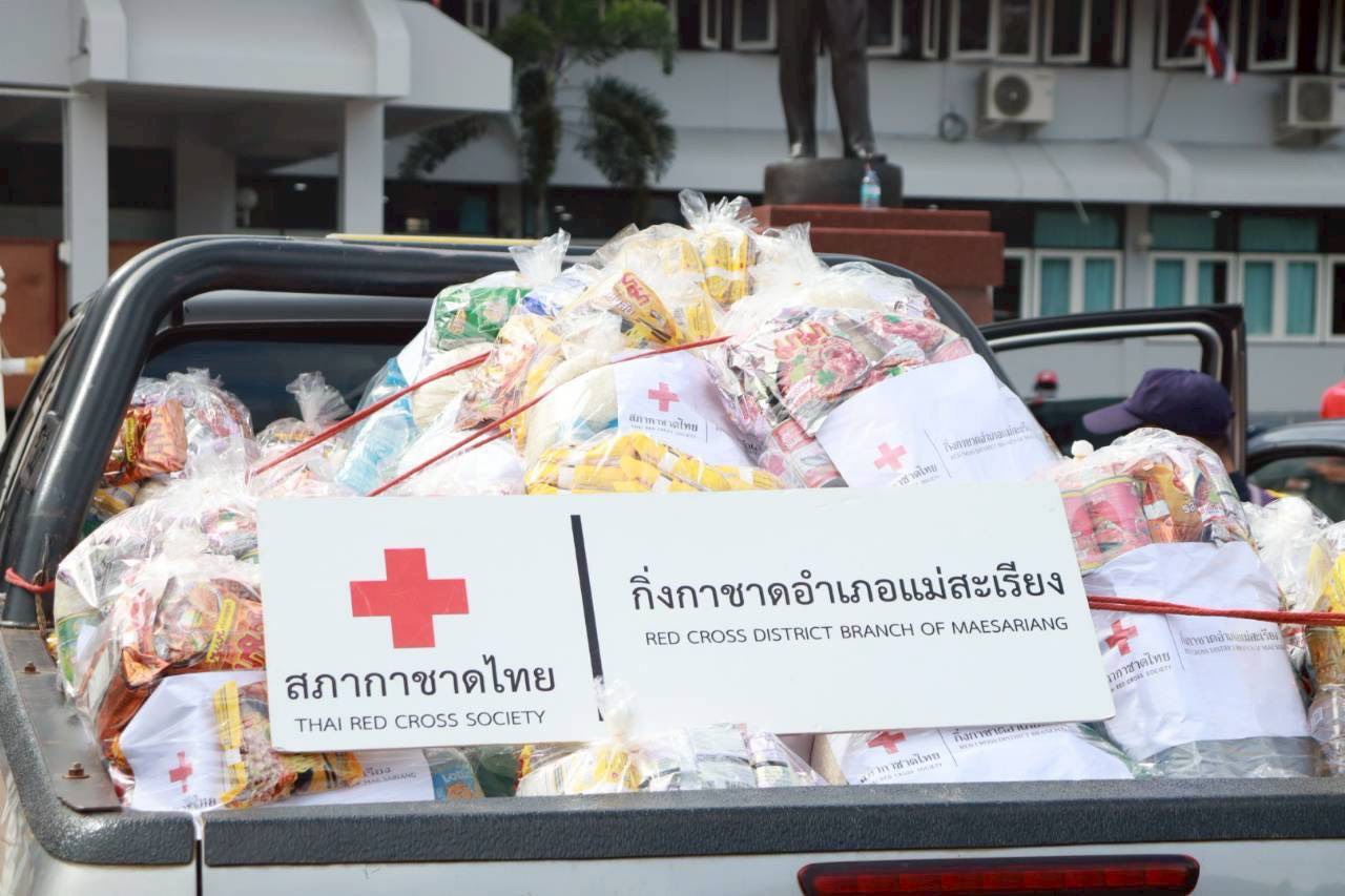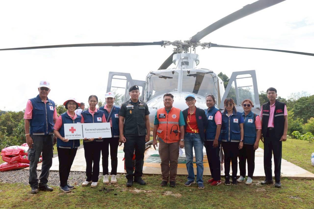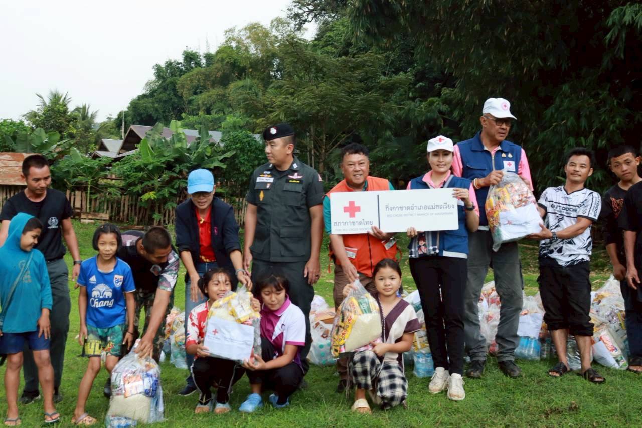 กิ่งกาชาดอำเภอแม่สะเรียง ลำเลียงถุงยังชีพ ช่วยเหลือผู้ประสบภัยในพื้นที่ห่างไกลชายแดนสาละวิน โดยการขนส่งทางอากาศยาน ด้วยเฮลิคอปเตอร์ ตชด. เนื่องจากถนนไปยังหมู่บ้านต้องอาศัยลำน้ำเป็นเส้นทางสัญจร ห้วงฤดูฝนน้ำป่าไหลหลากไม่สามารถเดินทางได้
