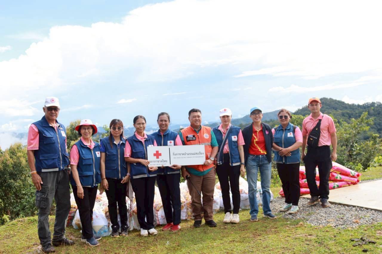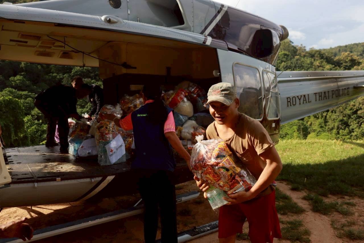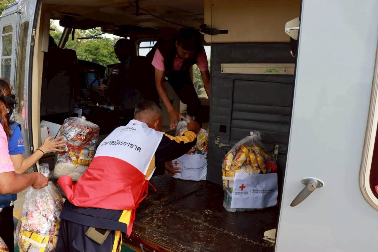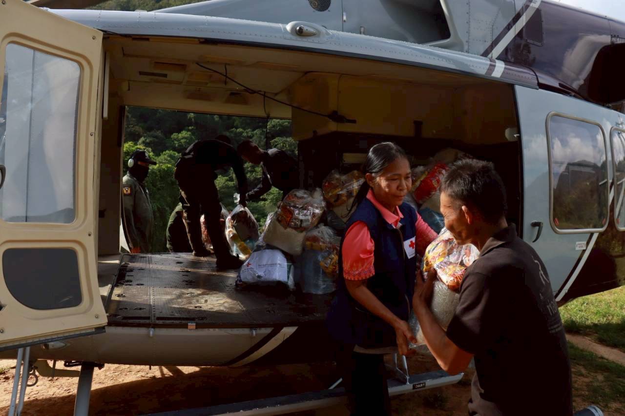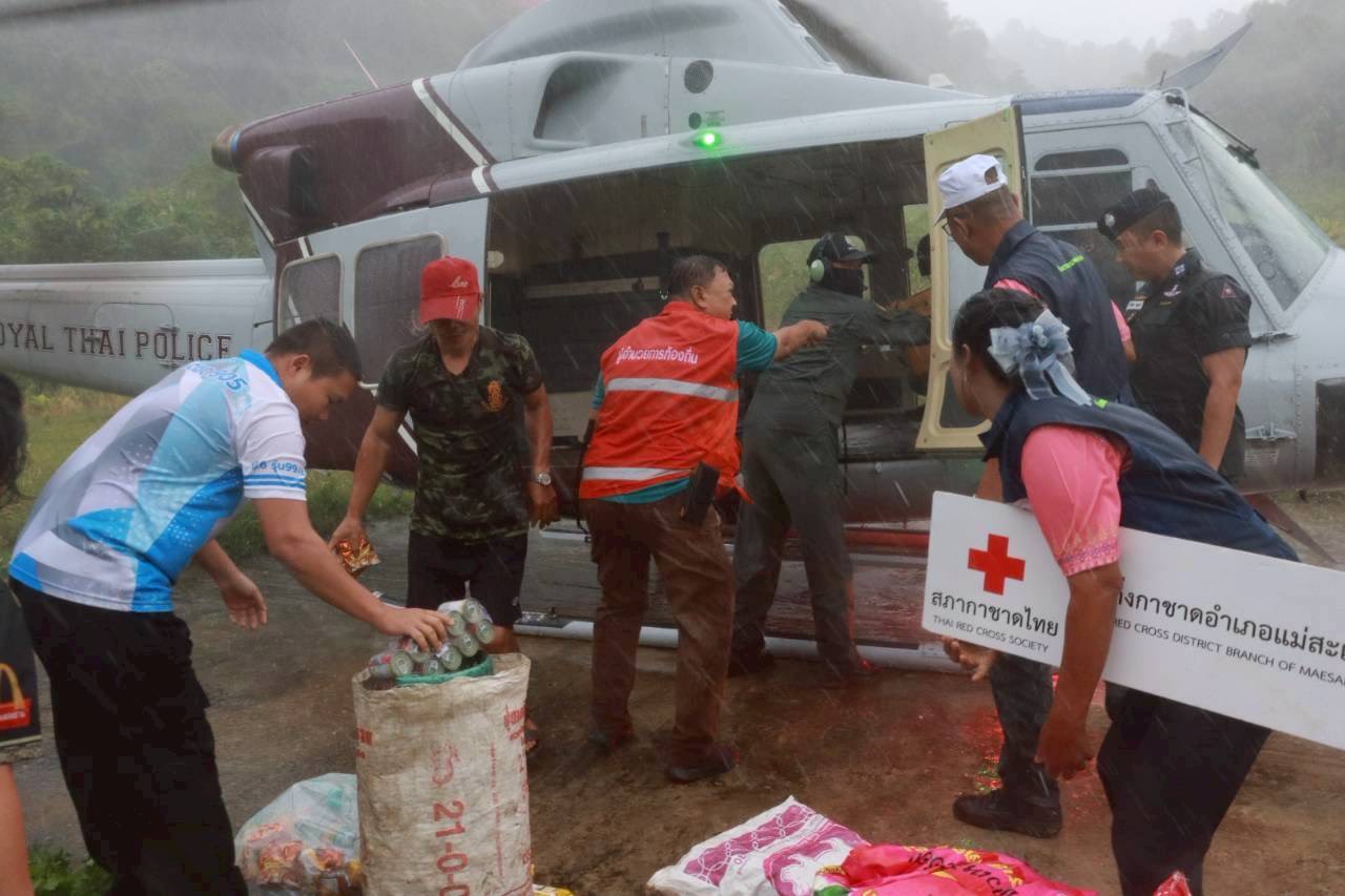 กิ่งกาชาดอำเภอแม่สะเรียง ลำเลียงถุงยังชีพ ช่วยเหลือผู้ประสบภัยในพื้นที่ห่างไกลชายแดนสาละวิน โดยการขนส่งทางอากาศยาน ด้วยเฮลิคอปเตอร์ ตชด. เนื่องจากถนนไปยังหมู่บ้านต้องอาศัยลำน้ำเป็นเส้นทางสัญจร ห้วงฤดูฝนน้ำป่าไหลหลากไม่สามารถเดินทางได้