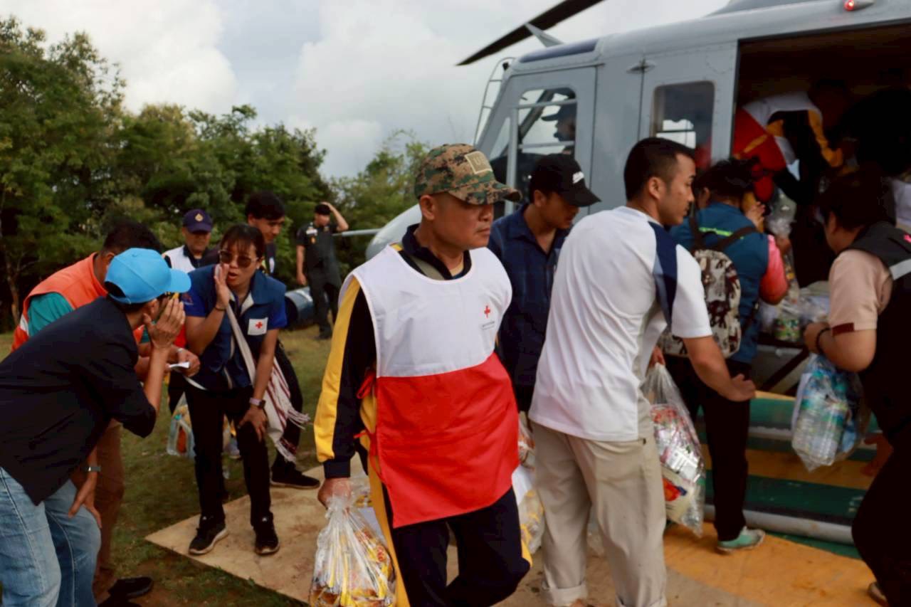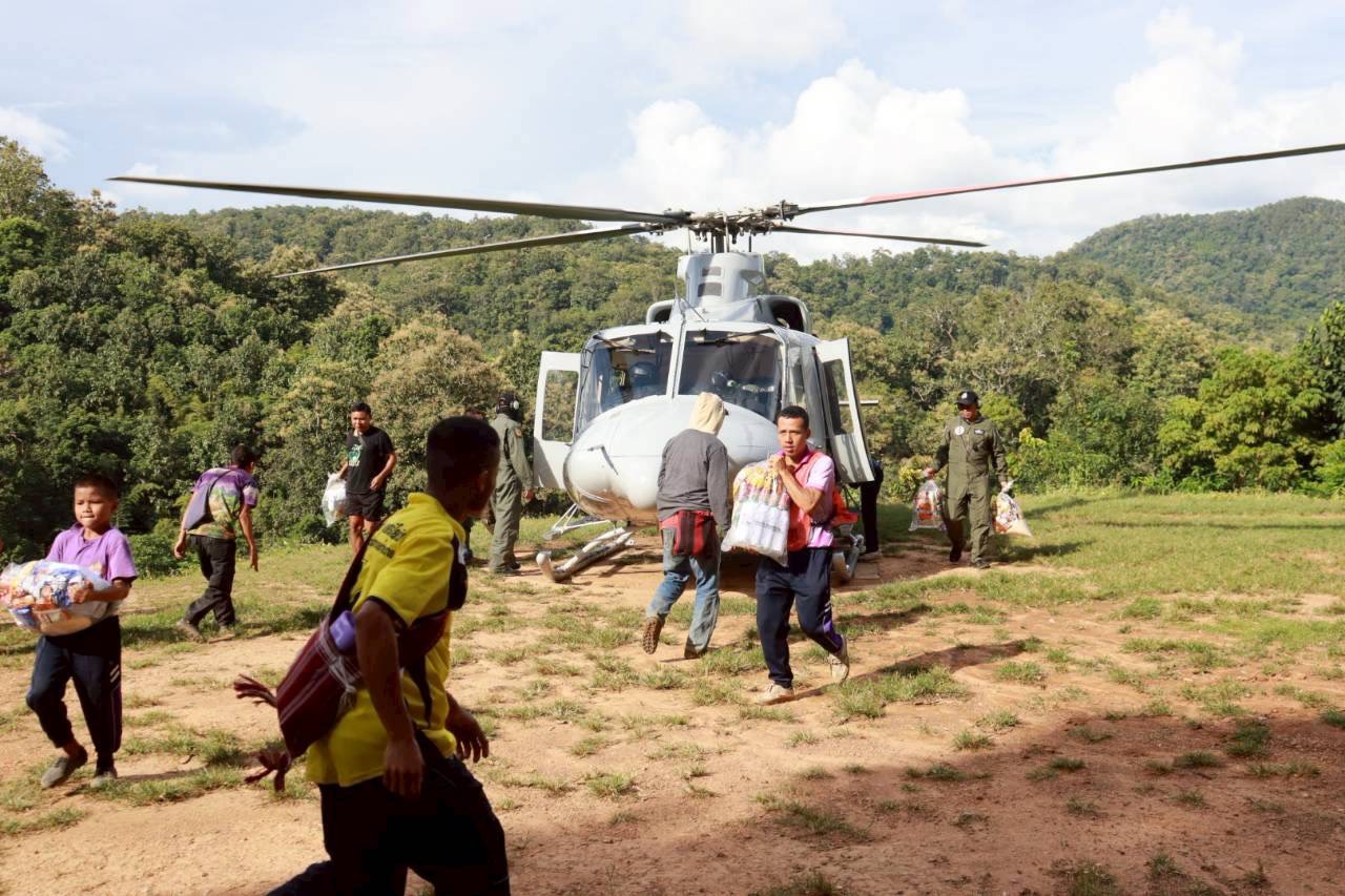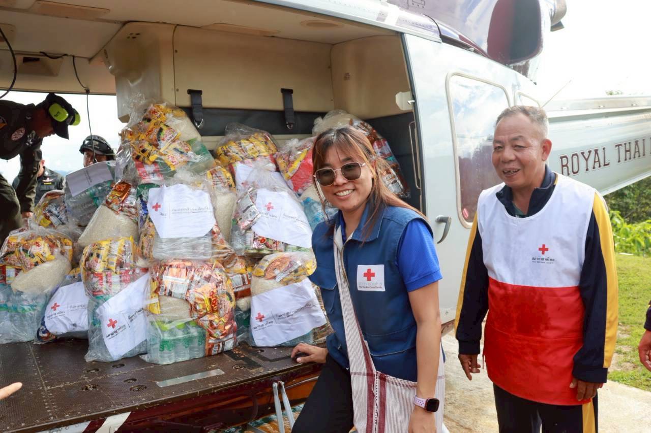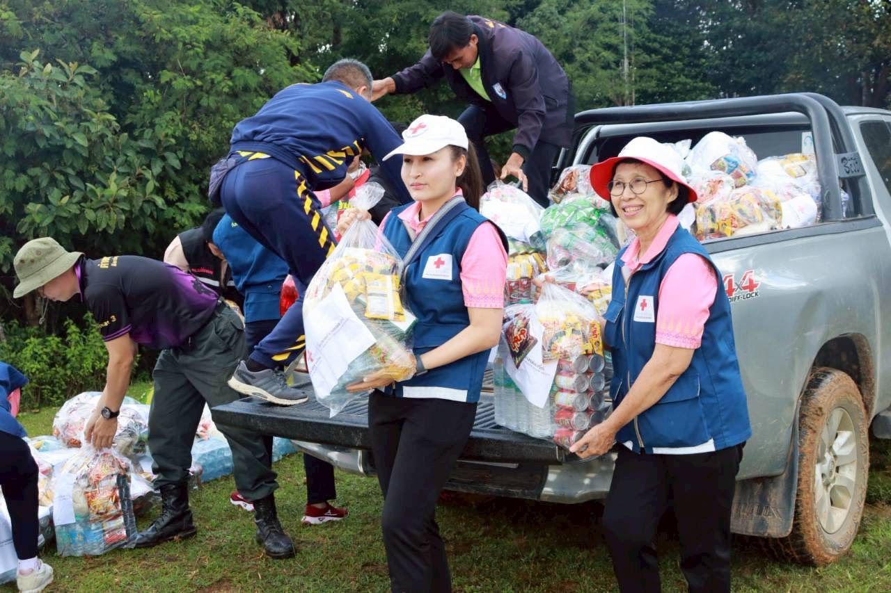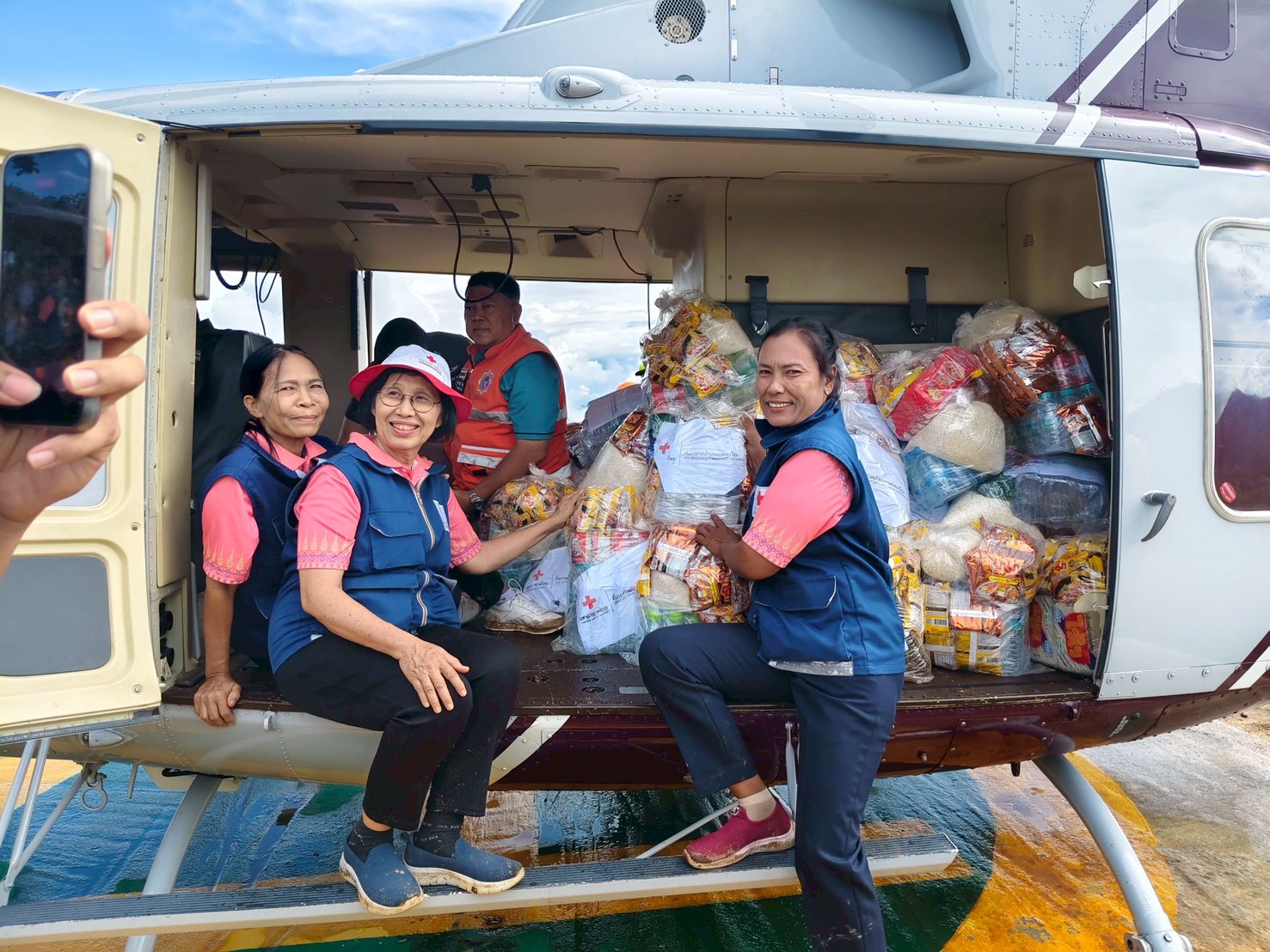 กิ่งกาชาดอำเภอแม่สะเรียง ลำเลียงถุงยังชีพ ช่วยเหลือผู้ประสบภัยในพื้นที่ห่างไกลชายแดนสาละวิน โดยการขนส่งทางอากาศยาน ด้วยเฮลิคอปเตอร์ ตชด. เนื่องจากถนนไปยังหมู่บ้านต้องอาศัยลำน้ำเป็นเส้นทางสัญจร ห้วงฤดูฝนน้ำป่าไหลหลากไม่สามารถเดินทางได้