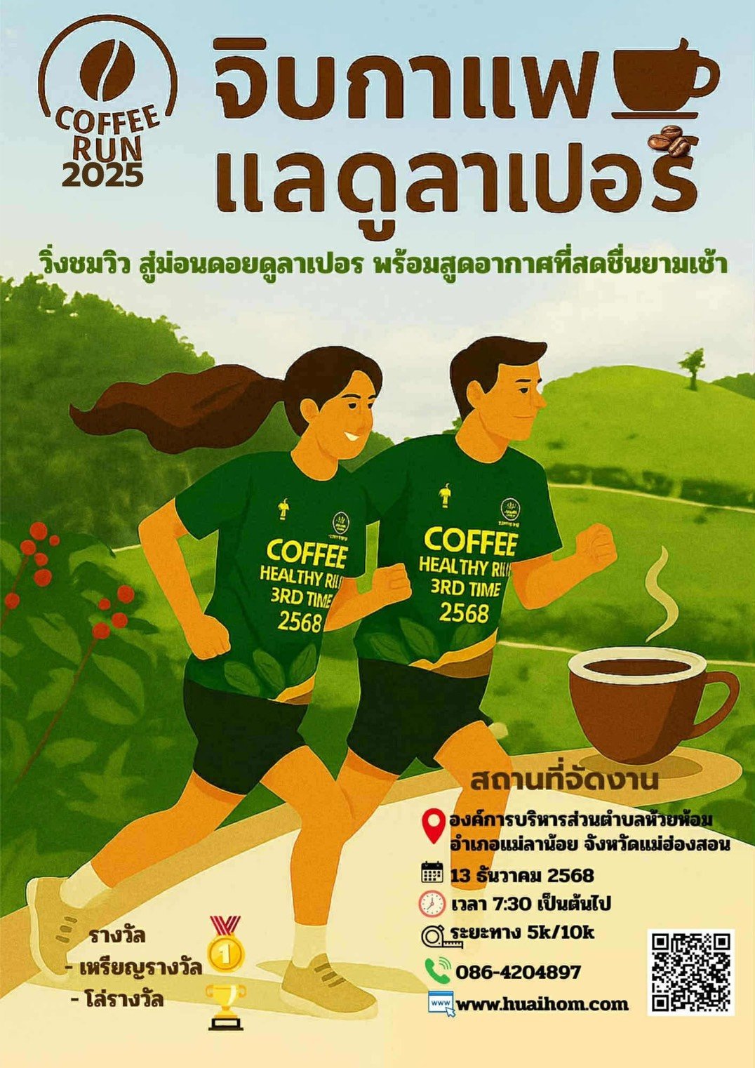 อบต.ห้วยห้อม อำเภอแม่ลาน้อย เชิญชวนวิ่งเพื่อสุขภาพ ส่งเสริมการท่องเที่ยวตำบลห้วยห้อม Coffee Healthy Run 3RD Time 2025 “จิบกาแฟ แลดูลาเปอร์” วันที่ 13 ธันวาคม 2568 นี้