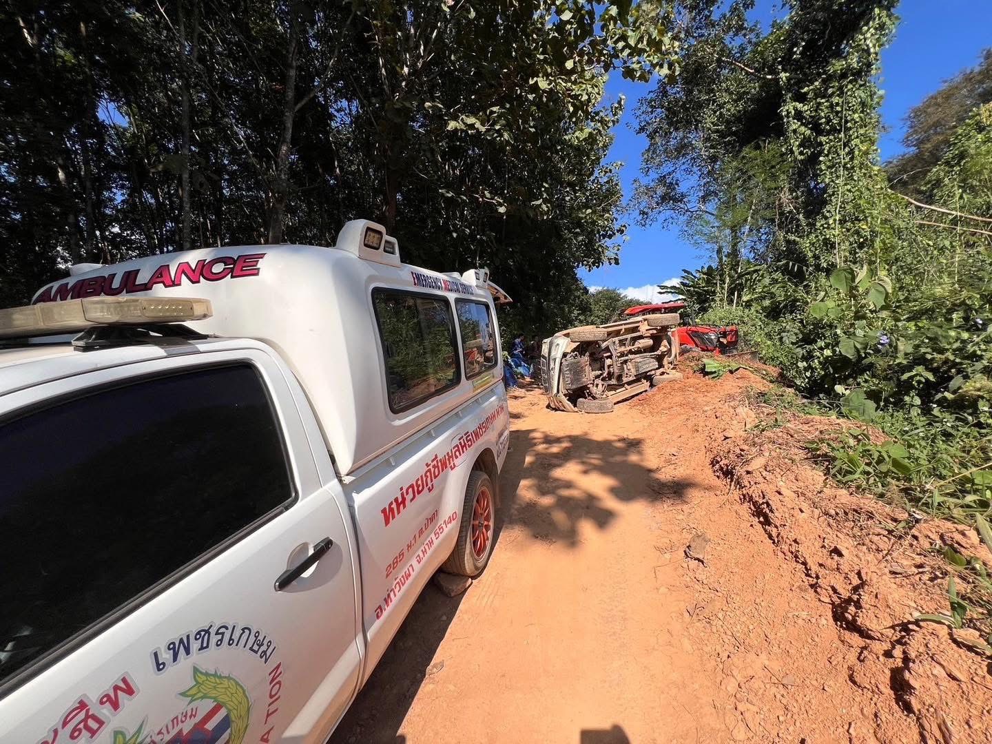 เมื่อวันที่ 9 ธันวาคม 2567 เวลา 13.30 น. ร.ต.อ.ธรรณรงค์ อินต๊ะกัน พงส.สภ.ท่าวังผา จ.น่าน ได้รับแจ้งจากศูนย์วิทยุนครน่าน 191 ตำรวจภูธรจังหวัดน่าน แจ้งว่า มีอุบัติเหตุรถยนต์กระบะพลิกคว่ำ ที่บริเวณ ทางไปสวน บ้านสบขุ่น – บ้านน้ำกาด (เขตบ้านสบขุ่น ม.7 ต.ป่าคา อ.ท่าวังผา จ.น่าน) มีผู้ได้รับบาดเจ็บหลายคน จึงรายงานให้ พ.ต.อ.สุริยา ขุนโต ผกก.สภ.ท่าวังผา รุดไปตรวจสอบในที่กิดเหตุพร้อมด้วย จนท.ตร.ชุดสืบสวนจำนวนหนึ่ง พบทีม จนท.มูลนิธิเพชรเกษมน่าน (สนง.ใหญ่ท่าวังผา) ,จนท.กู้ชีพ อปท.ในพื้นและทีมแพทย์ รพ.ท่าวังผา ในที่เกิดเหตุให้ความช่วยเหลือปฐมพยาบาลเบื้องต้น ณ จุดเกิดเหตุ ทั้งหมด 4 ราย เป็นชาย 1 ราย เป็นเด็กชาย 1 ราย เป็นหญิง จำนวน 2 รายก่อนนำส่งโรงพยาบาลท่าวังผาเพื่อให้ ความช่วยเหลือ ต่อไป