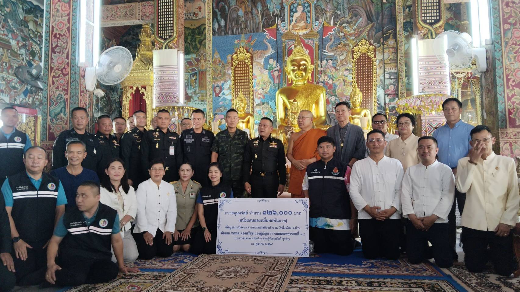 ต่อมา พันเอก ทศพล ผ่องศรีสุข ประธานอุปถัมภ์ พร้อมคณะผู้ร่วมอุปถัมภ์ ได้ถวาย กองทุนเพื่อบูรณปฏิสังขรณ์ศาลพระหลักเมืองน่าน แด่ประธานสงฆ์ รวมเป็นจำนวนเงิน 126,000 บาท (หนึ่งแสนสองหมื่นหกพันบาทถ้วน) เพื่อใช้ในการบูรณะศาลพระหลักเมืองน่านให้คงอยู่คู่เมืองน่านอย่างมั่นคงและงดงาม