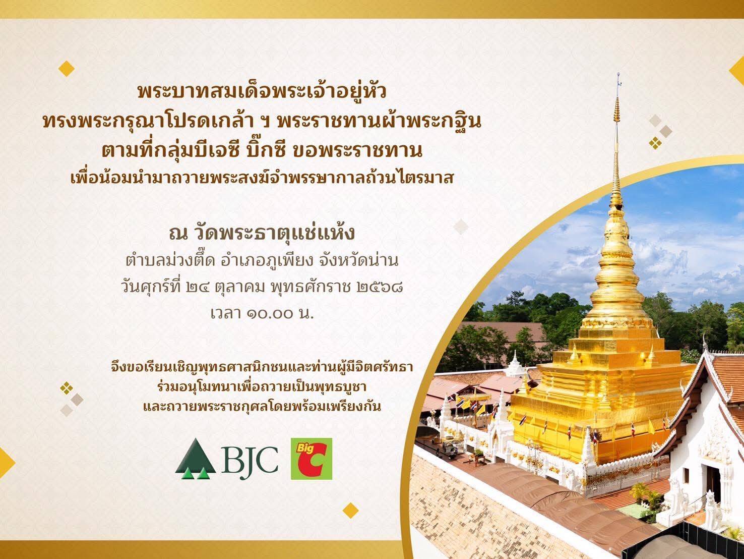 ตามที่ กลุ่มบริษัท บีเจซี บิ๊กซี ขอพระราชทาน เพื่อน้อมนำมาถวายพระสงฆ์ที่จำพรรษาครบถ้วนไตรมาส ณ วัดพระธาตุแช่แห้ง พระอารามหลวง ต.ม่วงตึ้ด อ.ภูเพียง จ.น่าน วันศุกร์ที่ 24 ตุลาคม 2568 (ตรงกับขึ้น 3 ค่ำ เดือน 12) เวลา 10.00 น. เป็นต้นไป