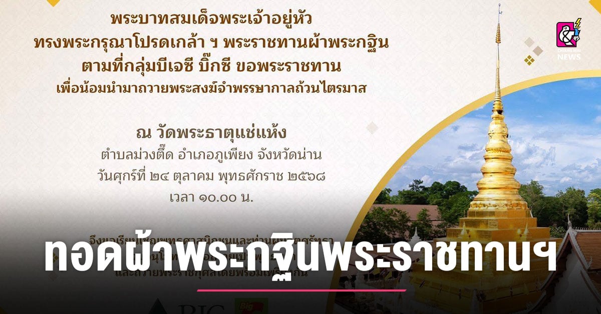 ตามที่ กลุ่มบริษัท บีเจซี บิ๊กซี ขอพระราชทาน เพื่อน้อมนำมาถวายพระสงฆ์ที่จำพรรษาครบถ้วนไตรมาส ณ วัดพระธาตุแช่แห้ง พระอารามหลวง ต.ม่วงตึ้ด อ.ภูเพียง จ.น่าน วันศุกร์ที่ 24 ตุลาคม 2568 (ตรงกับขึ้น 3 ค่ำ เดือน 12) เวลา 10.00 น. เป็นต้นไป