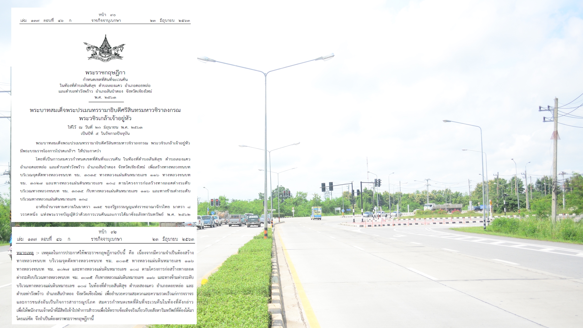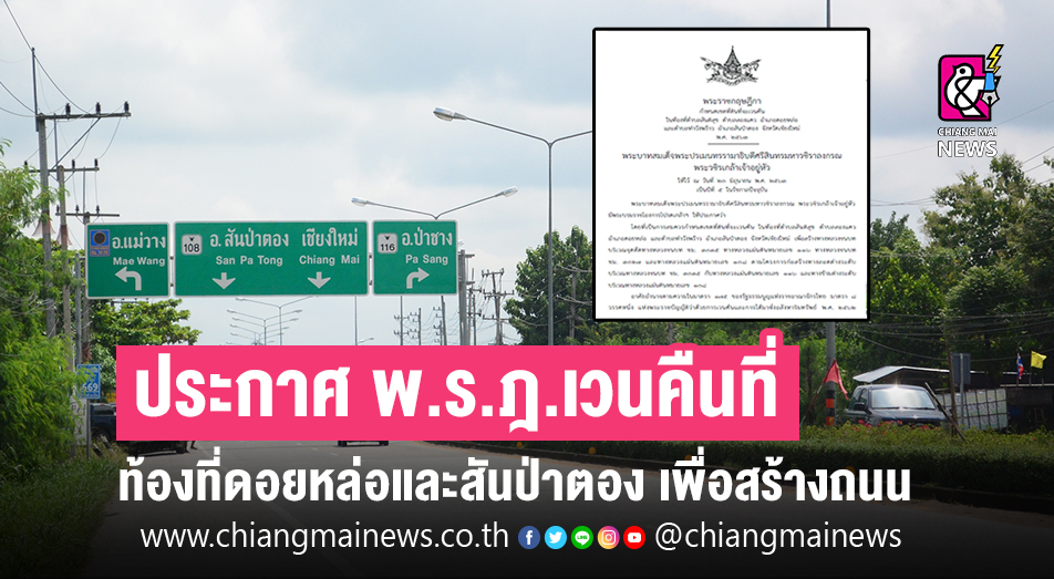ผู้สื่อข่าวรายงานว่า ราชกิจจานุเบกษา ได้ลงประกาศเล่ม 137 ตอนที่่ 46 ก.แจ้งพระราชกฤษฎีกา (พ.ร.ฎ.) กำหนดเขตที่ดินที่จะเวนคืนในท้องที่ ต.สันติสุข, ต.สองแคว อ.ดอยหล่อ และ ต.ท่าวังพร้าว อ.สันป่าตองจ.เชียงใหม่ เพื่อสร้างทางหลวงชนบท (ทช.) บริเวณจุดตัดทช.ชม 303 และทางหลวงแผ่นดิน (ทล.) 116 ทางหลวงชนบท ชม.3027 และทล. 108 ตามโครงการก่อสร้างทางลอดต่างระดับบริเวณ ทช.ชม.3035 กับทล.116 และทางข้ามต่างระดับบริเวณทล. 108 โดยอาศัยอำนาจตามมาตรา 175 ของรัฐธรรมนูญ มาตรา 8 วรรคหนึ่ง แห่ง พ.ร.บ.ว่าด้วยการเวนคืนและการได้มาซึ่งอสังหาริมทรัพย์ พ.ศ. 2562 และ มาตรา68/1 แห่ง พ.ร.บ.ทางหลวง พ.ศ. 2535 ฉบับแก้ไขเพิ่มเติมที่ 2 (พ.ศ. 2549) ทั้งนี้ มาตรา6 ในพระราชกฤษฎีกานี้ ระบุให้เริ่มต้นเข้าสำรวจที่ดิและอสังหาริมทรัพย์ที่อยู่ภายในแนวเขตที่ดินที่จะเวนคืนตามกำหนด ภายใน 180 วัน นับแต่พระราชกฤษฎีกาใช้บังคับ ซึ่งมีผลเมื่อ 24 มิ.ย. 2563 ที่ผ่านมา