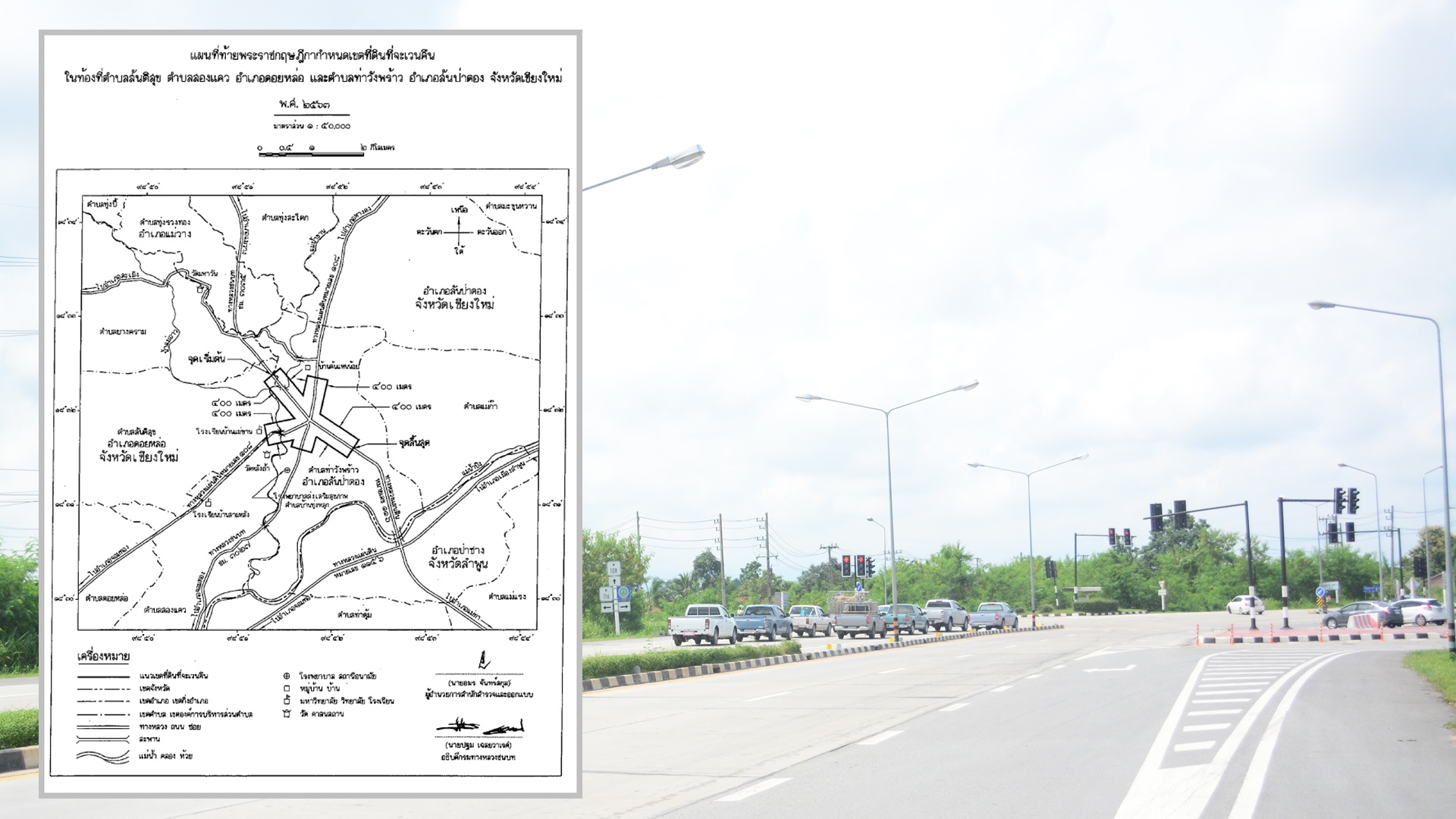 สำหรับพระราชกฤษฎีกานี้หลายภาคส่วนมีความพยายามผลักดัน นำเสนอมาตั้งแต่ปี 2549 โดยนำเสนอเขตที่ดินในบริเวณที่ที่จะเวนคืน ในท้องที่ ต.ท่าวังพร้าว ต.ทุ่งสะโตก ต.บ้านแม ต.น้ำบ่อหลวง อ.สันป่าตอง, ต.สันติสุข ต.ยางคราม ซึ่งขณะนั้นยังอยู่ในกิ่งอ.ดอยหล่อ อ.จอมทอง และ ต. ทุ่งรวงทอง ต.ดอนเปา อ.แม่วาง จ.เชียงใหม่ เพื่อสร้างถนนสายเชื่อมระหว่างทล. 108 กับถนนเลียบคลองชลประทาน จนกระทั่งพระราชกฤษฎีกา (พรฎ.) ซึ่งอยู่ในความรับผิดชอบของกระทรวงคมนาคม มีผลบังคับ เพื่อให้กรมทางหลวงชนบทดำเนินโครงการพื่อแก้ไขปัญหาจุดตัดบริเวณทางหลวงชนบท ชม.3035 เชื่อมต่อกับทางหลวง 116 และทางข้ามต่างระดับบริเวณทางหลวง108 ที่มีความเหมาะสมและสอดคล้องกับประมาณการปริมาณจราจรในพื้นที่