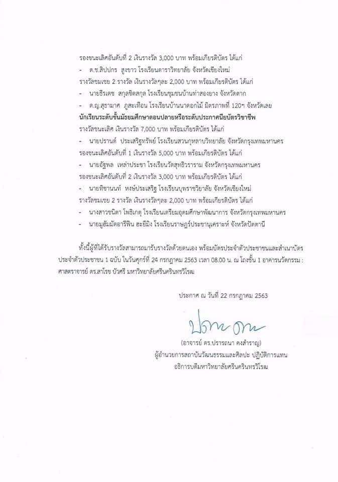 เข้ารับรางวัลในวันที่ 24 กรกฎาคม 2563 เวลา 8:00 น ณ โถงชั้น 1 อาคารนวัตกรรม : ศาสตราจารย์ ดร.สาโรช บัวศรี มหาวิทยาลัย ศรีนครินทรวิโรฒ