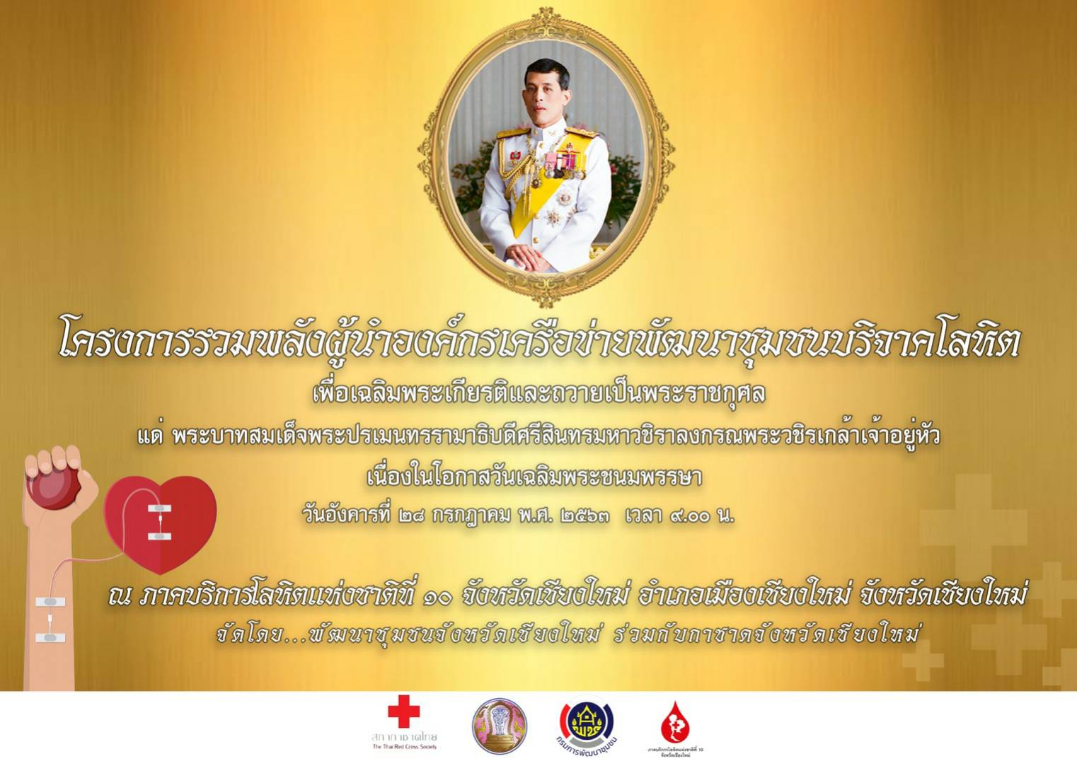ด้วยกรมการพัฒนาชุมชนได้จัดทำโครงการรวมพลังผู้นำ องค์กรเครือข่ายพัฒนาชุมชนบริจาคโลหิตเพื่อเฉลิมพระเกียรติและถวายเป็นพระราชกุศลแด่พระบาทสมเด็จพระปรเมนทรรามาธิบดีศรีสินทรมหาวชิราลงกรณ พระวชิรเกล้าเจ้าอยู่หัว เนื่องในโอกาสวันเฉลิมพระชนมพรรษา 28 กรกฎาคม 2563 จังหวัดเชียงใหม่โดยสำนักงานพัฒนาชุมชน ได้ประสานงานกับกาชาดจังหวัดเชียงใหม่ เพื่อขอนำคณะเจ้าหน้าที่และผู้นำ กลุ่มองค์กรภาคีเครือข่ายการพัฒนา จาก 25 อำเภอ เข้าร่วมบริจาคโลหิต ณ ภาคบริการโลหิตแห่งชาติที่ 10 จังหวัดเชียงใหม่ อำเภอเมือง จังหวัดเชียงใหม่ ในวันที่ 28 กรกฎาคม 2563 ตั้งแต่เวลา 08.30-15.30 น. โดยมีผู้เข้าร่วมโครงการทั้งสิ้น 228 คน