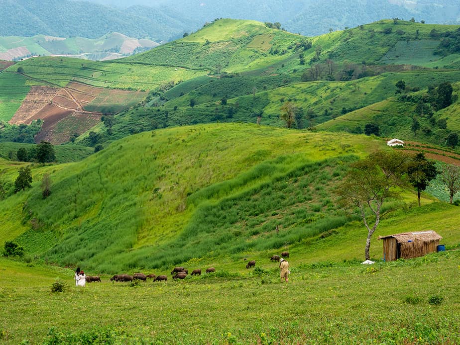 ทุ่งหญ้าโล่งเตียน สุดสายตา ที่เราสามารถมองเห็นทิวทัศน์โดยรอบ แต่เดิมพื้นที่ดังกล่าวเป็นพื้นที่ทำเกษตรกรรมในพื้นที่สูงของชาวบ้าน เมื่อสิ้นสุดฤดูการทำไร่ พื้นที่ดังกล่าวจึงเต็มไปด้วยหญ้าที่ขึ้นเขียวขจี ในฤดูฝน และในช่วงฤดูแล้ง ทุ่งหญ้าดังกล่าว จะเปลี่ยนสีเป็นสีเหลืองทอง ทำให้พื้นที่ดังกล่าว ที่สวยงามยามต้องแสงตะวัน เสมือนหนึ่งทุ่งหญ้าสะวันนาในแถบแอฟริกา