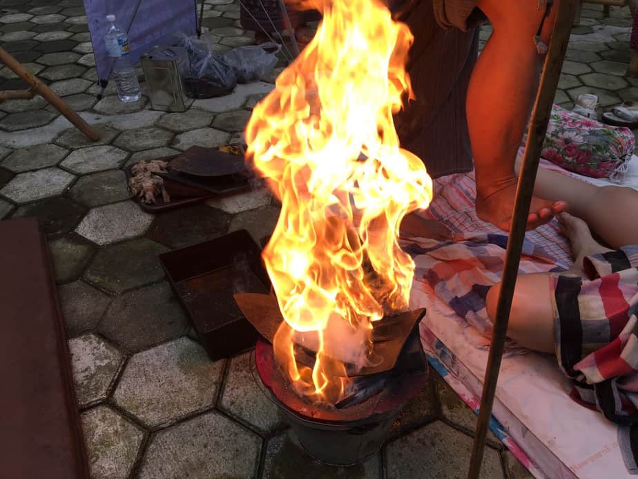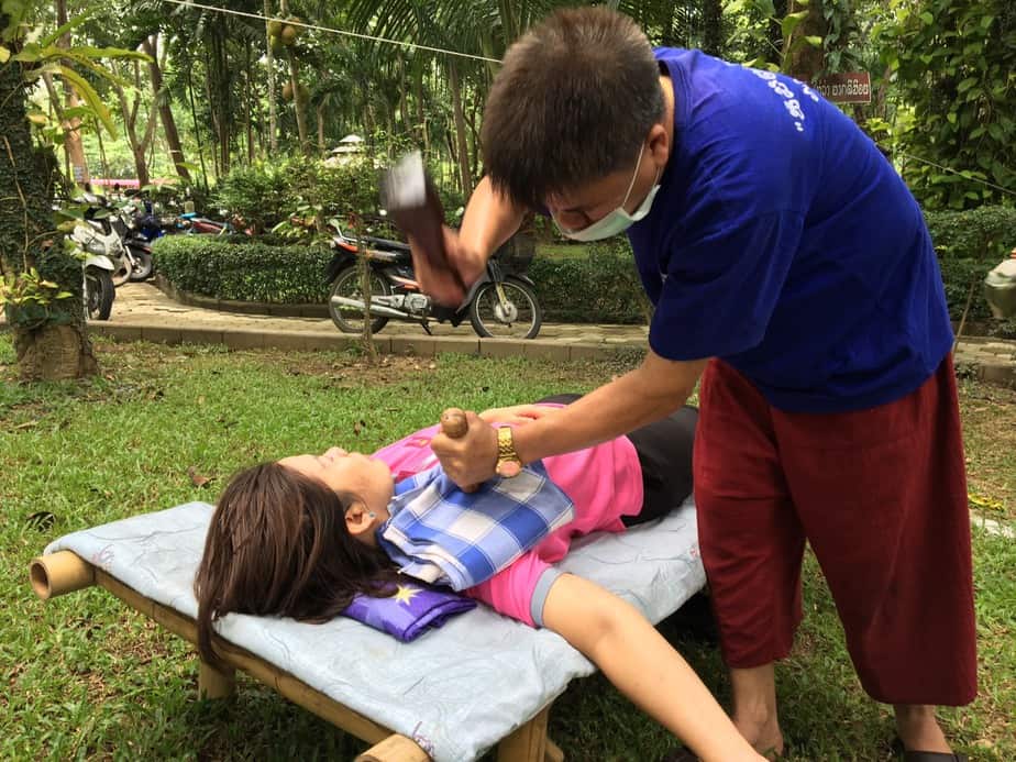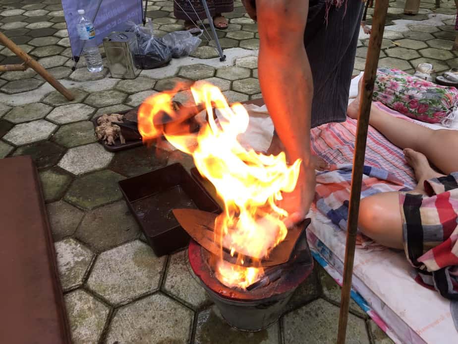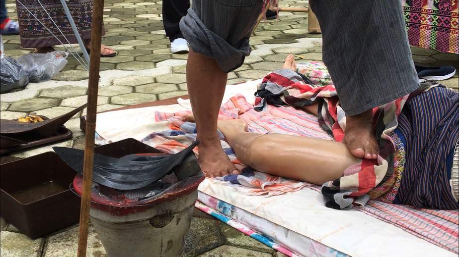 ที่น่าสนใจคือ “ย่ำขาง” การใช้ผ่าเท้านวดผู้ที่เจ็บป่วยของเส้นประสาทในร่างกาย ย่ำขาง คือการเอาเท้าชุบน้ำยา หรือน้ำมันงาผสมสุรา หรือตามแต่หมอย่ำขางแต่ละแห่งจะผสมสูตรอะไรลงไปในน้ำยานั้น ๆ แล้วไปย่ำ หรือวางบนขาง ที่เผาจนร้อนแดงแล้วไปย่ำบริเวณร่างกายผู้ป่วยที่มีอาการเจ็บปวด การรักษาด้วยวิธีนี้มีมาตั้งแต่อดีต และยังมีอยู่ในปัจจุบัน ถือว่าเป็นที่น่าสนใจของการสาธิตการรักษาในกิจกรรมวันนี้ เพราะทุกครั้งที่จะนวด ต้องย่ำแผ่นขางเกิดไฟลุกท่วมเท้าหมอย่ำขางทุกครั้ง