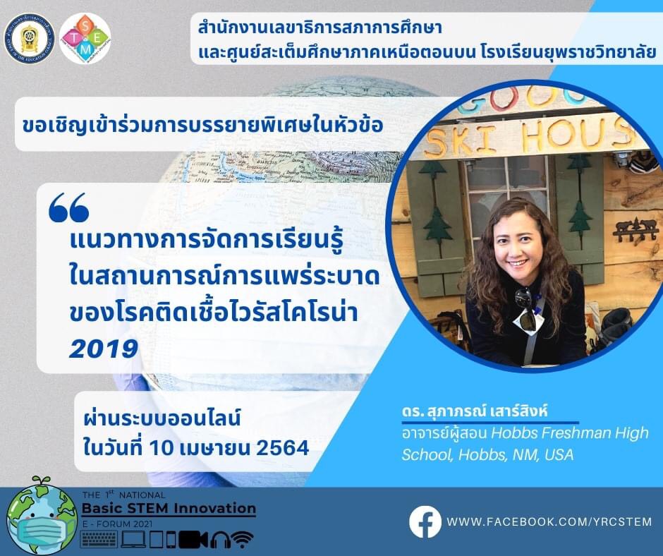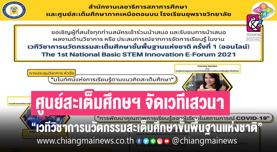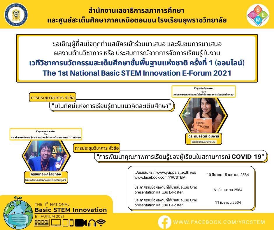 สำนักงานเลขาธิการสภาการศึกษา และศูนย์สะเต็มศึกษาภาคเหนือตอนบน โรงเรียนยุพราชวิทยาลัย ขอเชิญทุกท่านร่วมแลกเปลี่ยนเรียนรู้กัน ในงาน”เวทีวิชาการนวัตกรรมสะเต็มศึกษาขั้นพื้นฐานแห่งชาติ ครั้งที่ 1 (ออนไลน์)” “The 1st National Basic STEM Innovation E-Forum 2021” ระหว่างวันที่ 10 – 11 เมษายน พ.ศ.2564