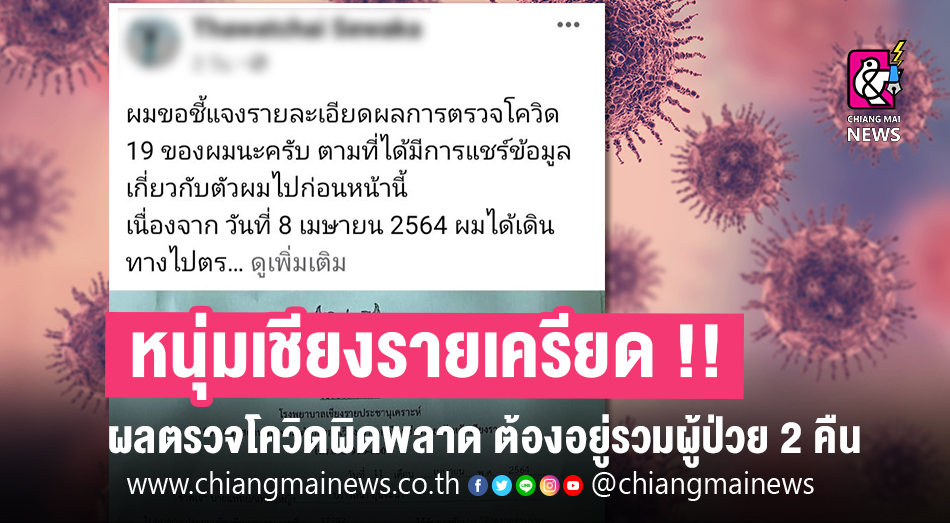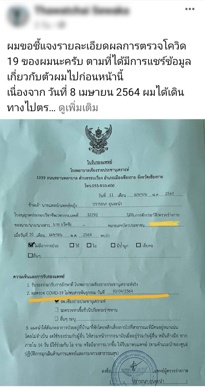 เมื่อวันที่ 15 เม.ย. 64 ผู้สื่อข่าวรายงานว่า ที่จังหวัดเชียงรายพบผู้ได้รับผลกระทบจากการแจ้งผลตรวจผิดพลาด จึงนำเรื่องราวที่พบเจอไประบายบนเฟสบุ๊กส่วนตัว ใจความว่า “ผมขอชี้แจงรายละเอียดผลการตรวจโควิด-19 ของผมนะครับ ตามที่ได้มีการแชร์ข้อมูลเกี่ยวกับตัวผมไปก่อนหน้านี้