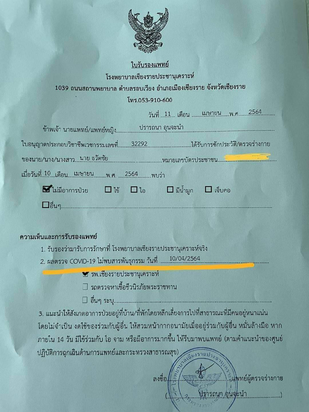 เนื่องจาก วันที่ 8 เมษายน 2564 ผมได้เดินทางไปตรวจโควิด-19 ที่โรงพยาบาลเอกชน ในจังหวัดเชียงราย เมื่อตรวจเสร็จผมก็กลับบ้าน เวลาประมาณ 23.29 น. ได้มีเจ้าหน้าที่ของ รพ.ติดต่อมาแจ้งผลการตรวจของผมว่าผลตรวจเป็นบวก (ติดเชื้อ) ?? เจ้าหน้าที่จึงนัด เพื่อที่จะเข้ารับการรักษาในวันที่ 9 เมษายน เวลา 10.00 น. ที่โรงพยาบาลเชียงรายประชานุเคราะห์ ผมจึงรีบเข้ารับการรักษาตามปกติของผู้ป่วยที่ติดเชื้อโควิด-19 ที่ โรงพยาบาลเชียงรายประชานุเคราะห์ แล้วในวันที่ 10 เมษายน ผมได้ลองเข้าไปเช็คผลตรวจโควิด-19 ในไลน์ของโรงพยาบาลเอกชนที่ตรวจรอบแรกอีกครั้ง ด้วยความอยากรู้ของผม ผลที่ปรากฏขึ้นมาเป็น Not Detected (ไม่ติดเชื้อ) ผมจึงรีบติดต่อกลับทางโรงพยาบาลฯ เพื่อให้เจ้าหน้าที่ตรวจสอบผลอีกครั้ง เวลาประมาณ 11.00 น. เจ้าหน้าที่โรงพยาบาลเชียงรายประชานุเคราะห์ ได้แจ้งให้ผมไปตรวจอีกครั้ง ต่อมาช่วงประมาณ 21.00 น. เจ้าหน้าที่แจ้งผลการตรวจโควิด-19 อีกครั้งว่าผลตรวจของผมเป็นลบ หรือไม่ติดเชื้อโควิด-19 ทางเจ้าหน้าที่ได้ย้ายผมไปอยู่อีกห้อง ร่างกายของผมปกติดีทุกอย่าง ไม่มีไข้ ไม่มีอาการอะไรเลย แล้ววันนี้ 11 เมษายน เข้าพบแพทย์ และสามารถกลับบ้านได้