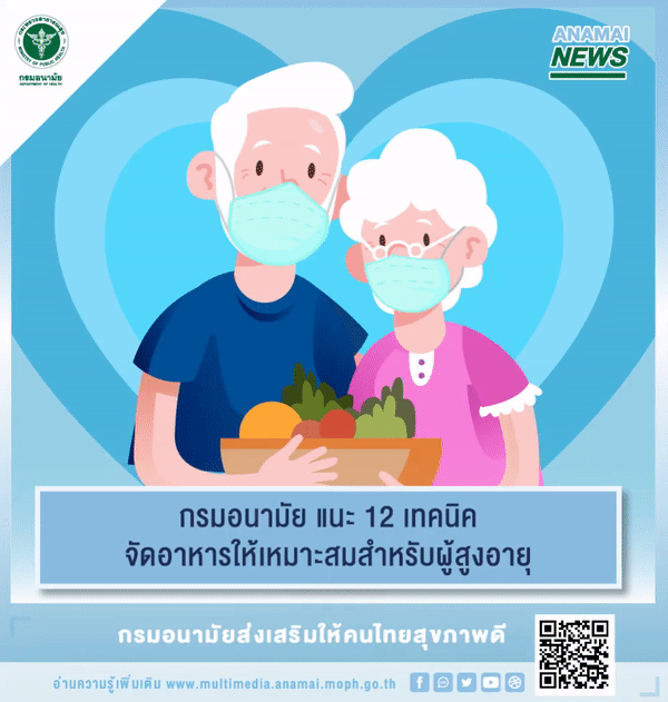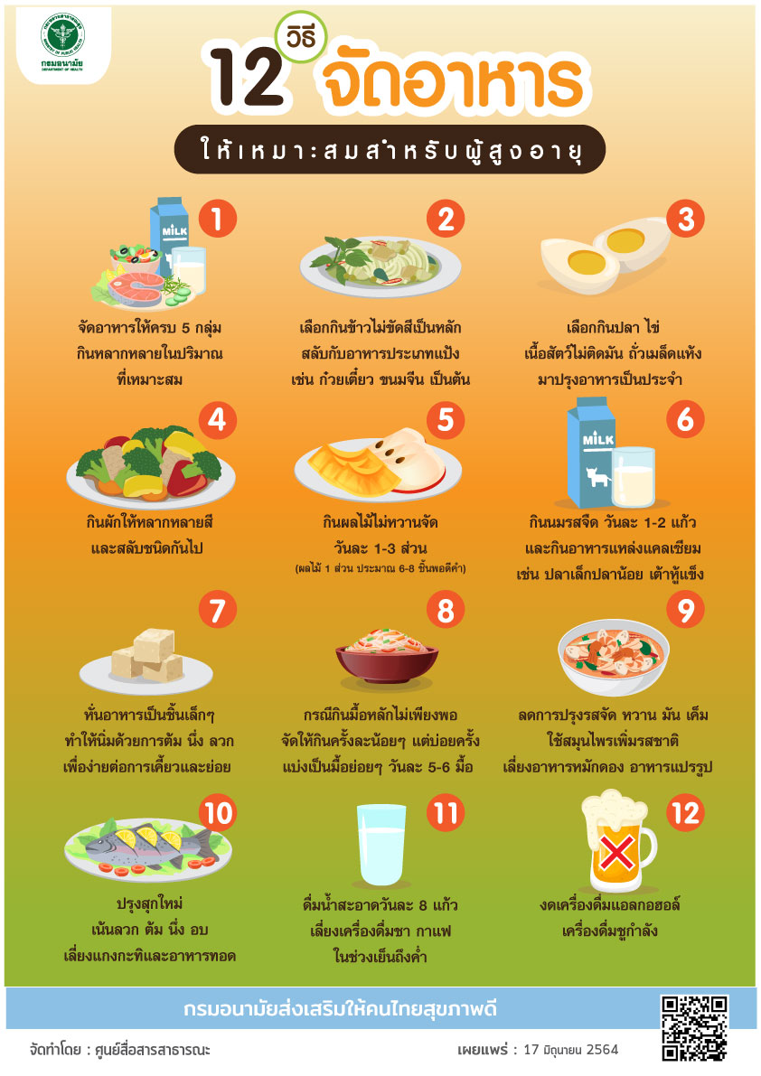 กรมอนามัย กระทรวงสาธารณสุข แนะนำ 12 เทคนิคในการจัดอาหารถูกหลักโภชนาการเพื่อส่งเสริมให้ผู้สูงอายุมีพฤติกรรมการกินอาหารที่เหมาะสมตามวัย สร้างสุขภาพดี