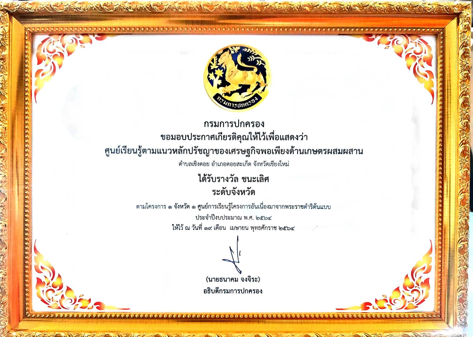 แม่หลวงนุ้ย รับรางวัลชนะเลิศอันดับ 1 ระดับจังหวัดเชียงใหม่ ตาม “โครงการ 1 จังหวัด 1 ศูนย์เรียนรู้โครงการอันเนื่องมาจากพระราชดําริต้นแบบ” โดยท่านศุภชัย เอี่ยมสุวรรณ ผู้ว่าราชการจังหวัดเชียงใหม่ เป็นผู้ใบประกาศเกียรติคุณ