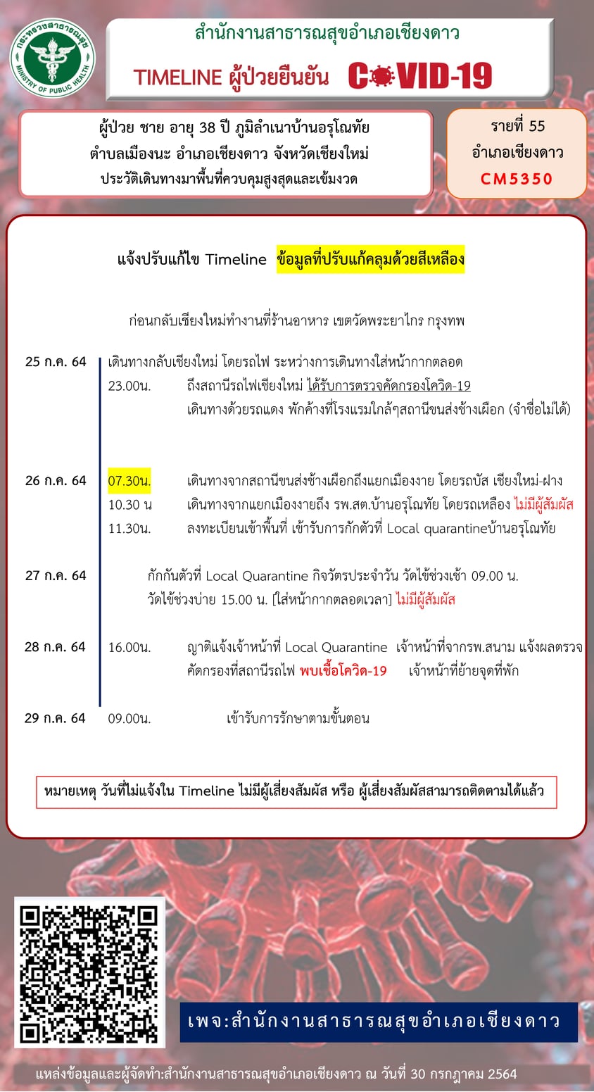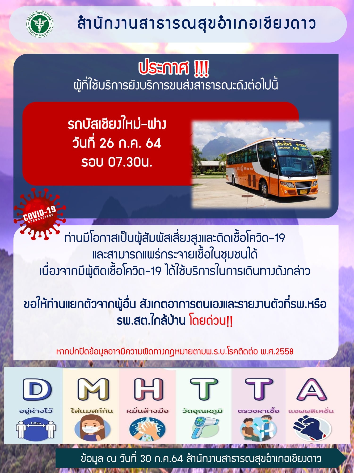 สำนักงานสาธารณสุขอำเภอเชียงดาว ประกาศ !!! ผู้ที่ใช้บริการยังบริการขนส่งสาธารณะ รถบัสเชียงใหม่-ฝาง วันที่ 26 ก.ค. 64 รอบ 07.30น.