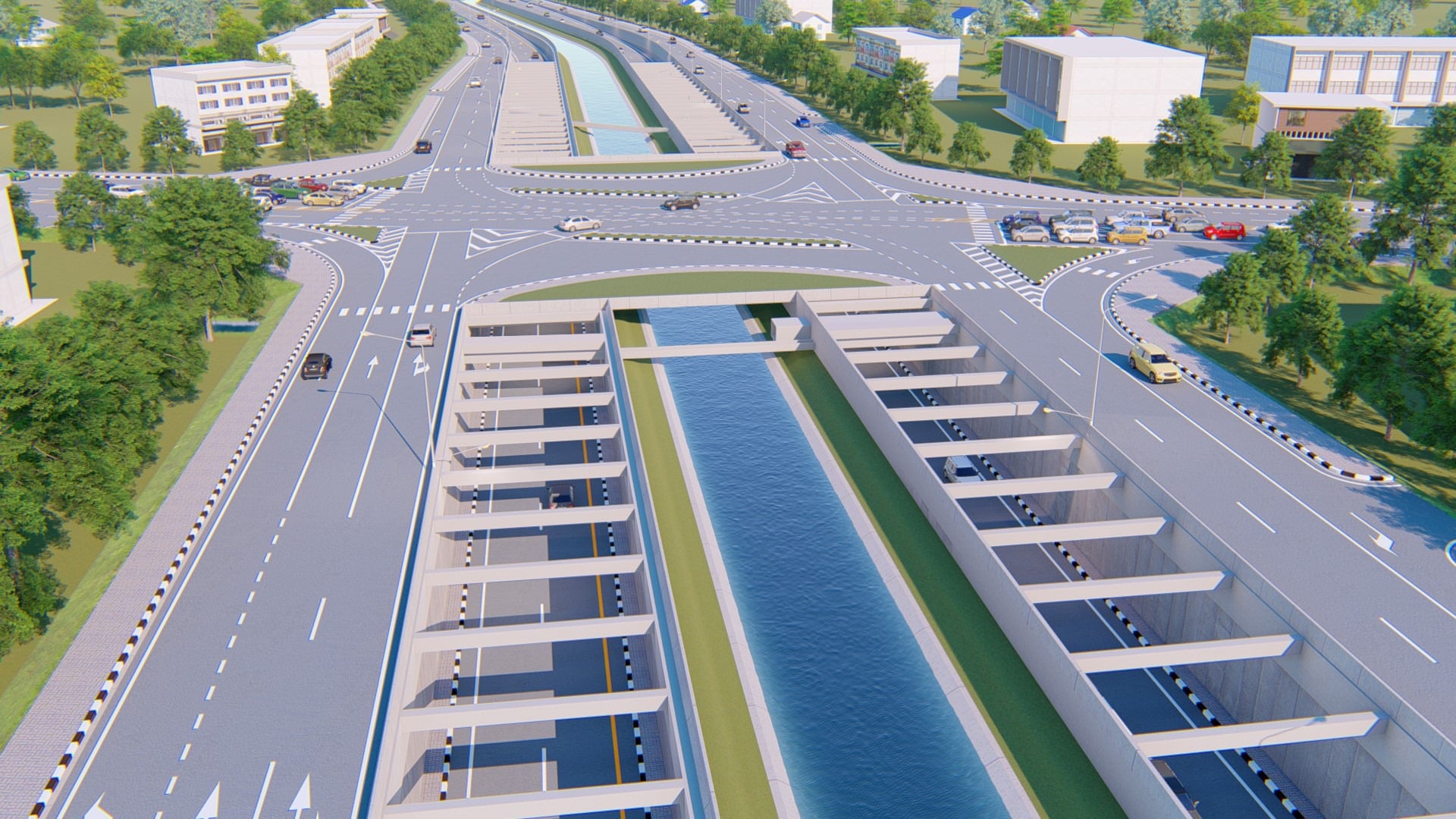 - ก่อสร้างทางลอดคู่ขนานด้านละ 2 ช่องจราจร กว้างช่องจราจรละ 3.50 เมตร ความยาว 462.50 เมตร รวมถึงโครงสร้างข้ามคลองชลประทานบนทางแยก กว้าง 70 เมตร ยาว 17 เมตร