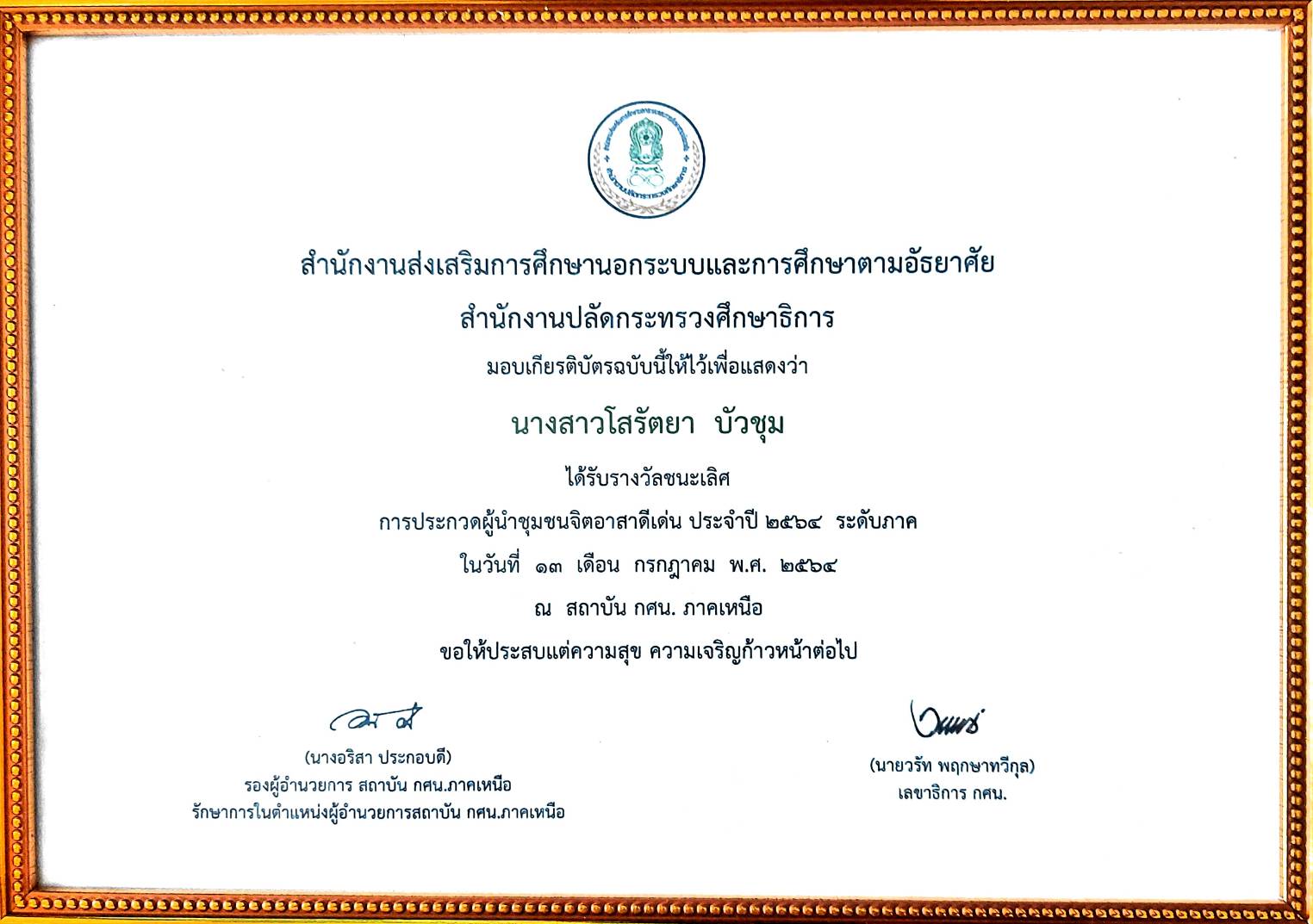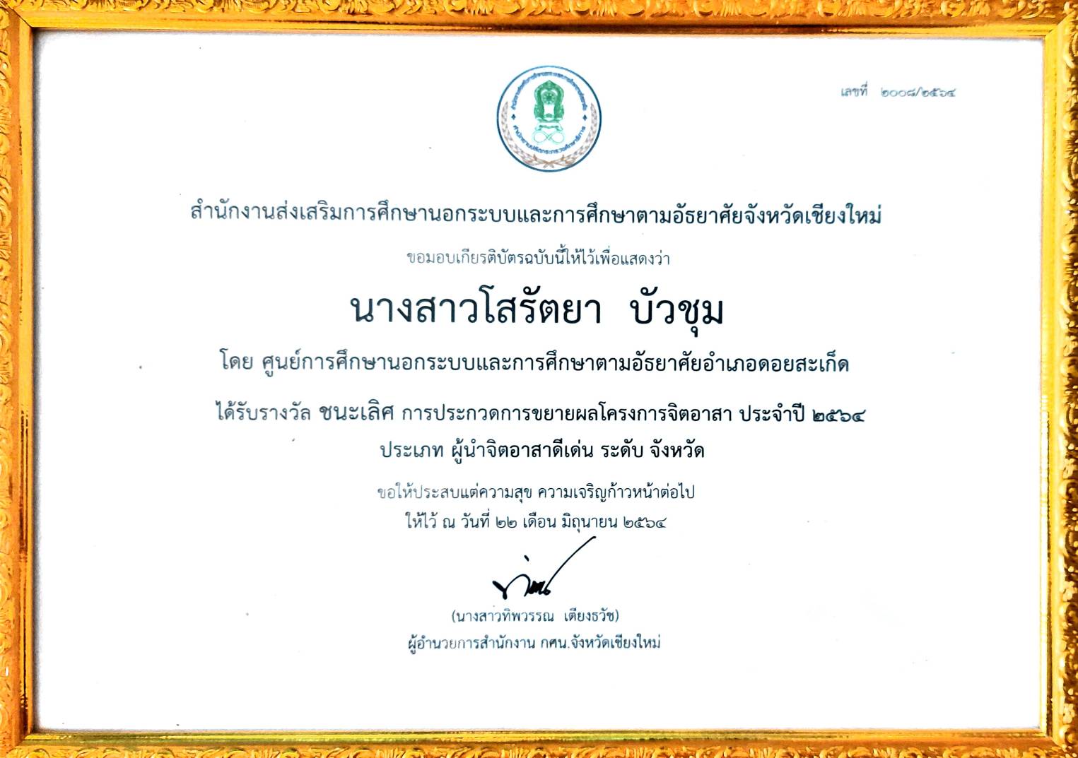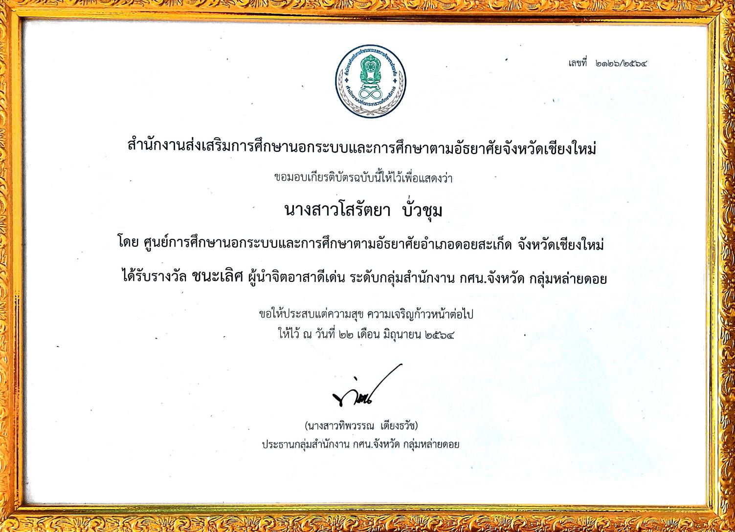 เมื่อวันที่ 4 ก.ย. 2564 ผู้สื่อข่าวรายงาน และร่วมแสดงความยินดีกับทาง นางสาวโสรัตยา บัวชุม หรือแม่หลวงนุ้ยส์ ผู้ใหญ่บ้านแหนบทองคำยอดเยี่ยม ประจำปี 2562 ซึ่งในปีนี พ.ศ.2564 ได้รับมอบเกียรติบัตร จากท่านกิตติพัฒน์ กะวัง นายอำเภอดอยสะเก็ด จังหวัดเชียงใหม่ เดินทางรับเกียรติบัตรและรางวัลไปเมื่อวันที่ 2 ก.ย.ที่ผ่านมา ประกอบไปด้วย 1. เกียรติบัตร รางวัลชนะเลิศ ผู้นำชุมชนจิตอาสาดีเด่นประจำปี 2564 ระดับภาคเหนือ, 2. รางวัลชนะเลิศ ผู้นำจิตอาสาดีเด่น ระดับกลุ่มสำนักงาน กศน.จังหวัด กลุ่มหล่ายดอย, 3. รางวัลชนะเลิศ การประกวดขยายผล โครงการจิตอาสาประจำปี 2564 ประเภทผู้นำจิตอาสาดีเด่น ระดับจังหวัดเชียงใหม่