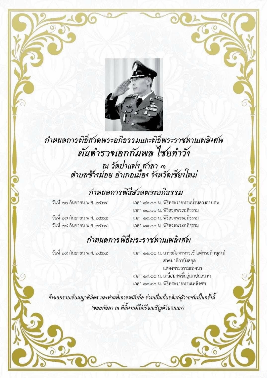 ข่าวคืบหน้ากรณี พ.ต.อ.กัมพล ไชยคำวัง ท.ม.,ต.ช. วัย 65 ปีมีภูมิลำเนาอยู่ในจังหวัดเชียงใหม่ ได้เสียชีวิตอย่างสงบด้วยโรงมะเร็ง ที่โรงพยาบาลวิภาวดี เมื่อเวลา 04.51 น.วันที่ 24 ก.ย.2564 นั้น ซึ่งทางญาติๆได้นำศพมาประกอบพิธีตามศาสนา ณ ศาลา 3 วัดป่าแพ่ง ต.ช้างม่อย อ.เมือง เชียงใหม่ มีกำหนดการดังนี้