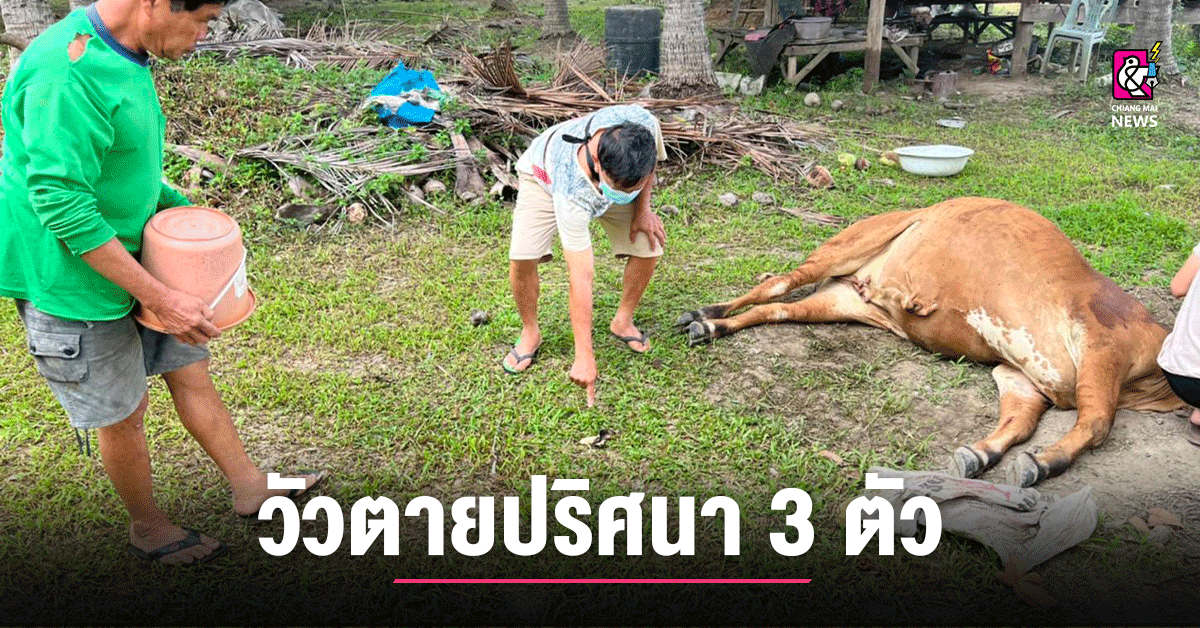 จากกการสอบถาม นายประเสริฐ หมั่นเรียน อายุ 65 ปี บ้านเลขที่ 43 ม.3 ต.บ้านกาศ อ.สูงเม่น เจ้าของวัวทราบว่า เมื่อวานตอนเย็น นำวัวเข้ามามัดในสวน จำนวน 5 ตัว ตื่นเช้าวันนี้ มีคนไปแจ้งว่าเห็นวัว นอนตายในสวนให้ไปดูด้วย ก็พบว่าวัวได้ตายไป 3 ตัว อย่างไม่รู้สาเหตุ ส่วนอีกก 2 ตัว มีอาการปกติ จึงได้แจ้งเจ้าหน้าที่ตำรวจมาตรวจสอบ เพราะไม่เชื่อว่าวัวจะตายตามปกติ