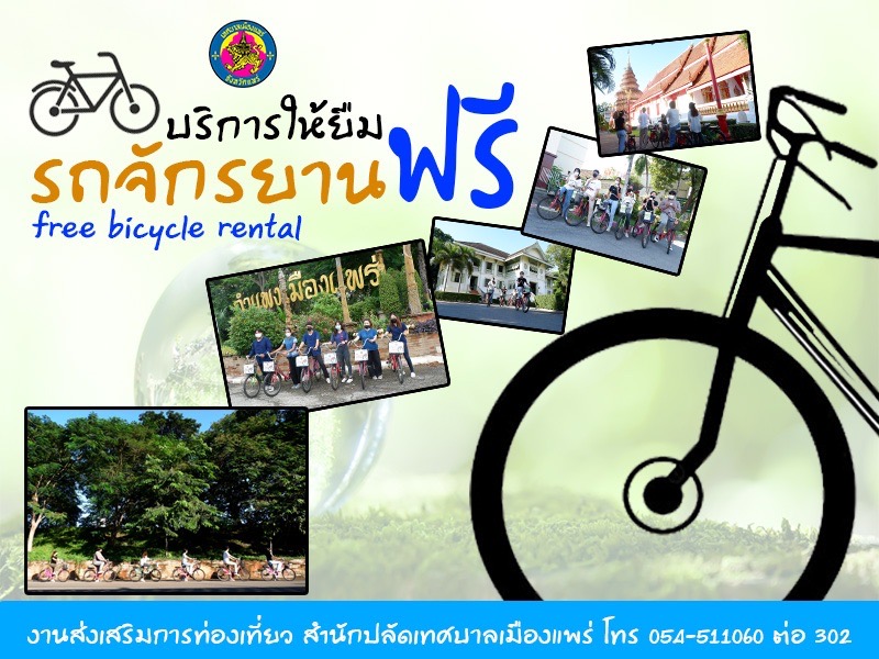 งานส่งเสริมการท่องเที่ยว สำนักปลัดเทศบาลเมืองแพร่ ให้บริการยืมรถจักรยาน ฟรี เพื่อให้นักท่องเที่ยวและประชาชนทั่วไป สามารถนำรถจักรยาน ปั่นชมและสัมผัสศิลปวัฒนธรรม ประเพณี วิถีชีวิต ของชาวเมืองแพร่ ให้บริการ ตั้งแต่เวลา 08.30 – 16.30 น. ในวันและเวลาราชการ และในวันเสาร์ -อาทิตย์ ท่านสามารถติดต่อได้ที่ห้องวิทยุไชยบูรณ์ งานป้องกันและบรรเทาสาธารณภัยเทศบาลเมืองแพร่ โทร 054 – 511617 โดยนักท่องเที่ยว และประชาชนทั่วไปสามารถแสดงบัตรประจำตัวประชาชนของท่าน แก่เจ้าหน้าที่ สอบถามรายละเอียดได้ที่งานส่งเสริมการท่องเที่ยว สำนักปลัดเทศบาลเมืองแพร่ โทร 054-511060 ต่อ 302