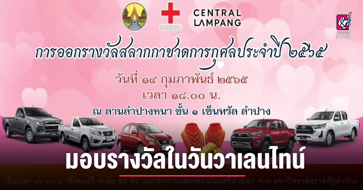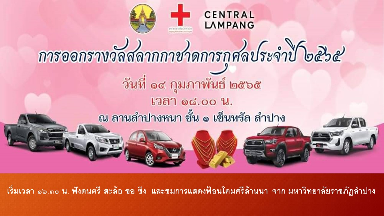 การหมุนวงล้อออกเลขรางวัลสลากกาชาด มีกำหนดจัดขึ้นในวันที่ 14 กุมภาพันธ์ 2565 เวลา 18.00 น. ณ ศูนย์การค้าเซ็นทรัลพลาซ่าลำปาง ภายใต้มาตรการป้องกันโควิด-19 ตามที่กระทรวงสาธารณสุขกำหนดอย่างเคร่งครัด โดยจะถ่ายทอดสดผ่านทาง Facebook Live เพจ สวท.ลำปาง กรมประชาสัมพันธ์ หรือติดตามรับฟังบรรยากาศทางวิทยุ สวท. ลำปาง ระบบ FM 97 MHz.