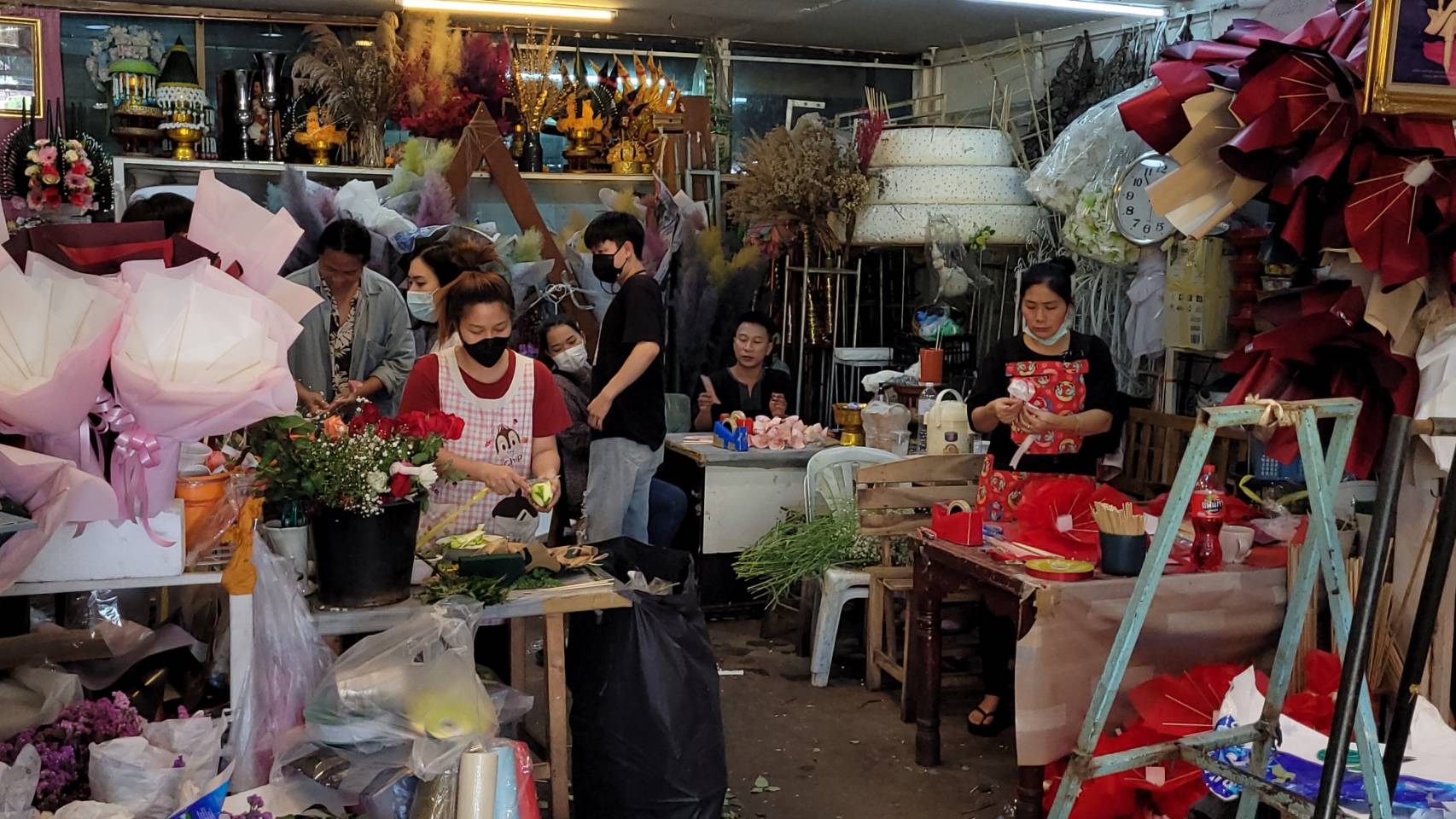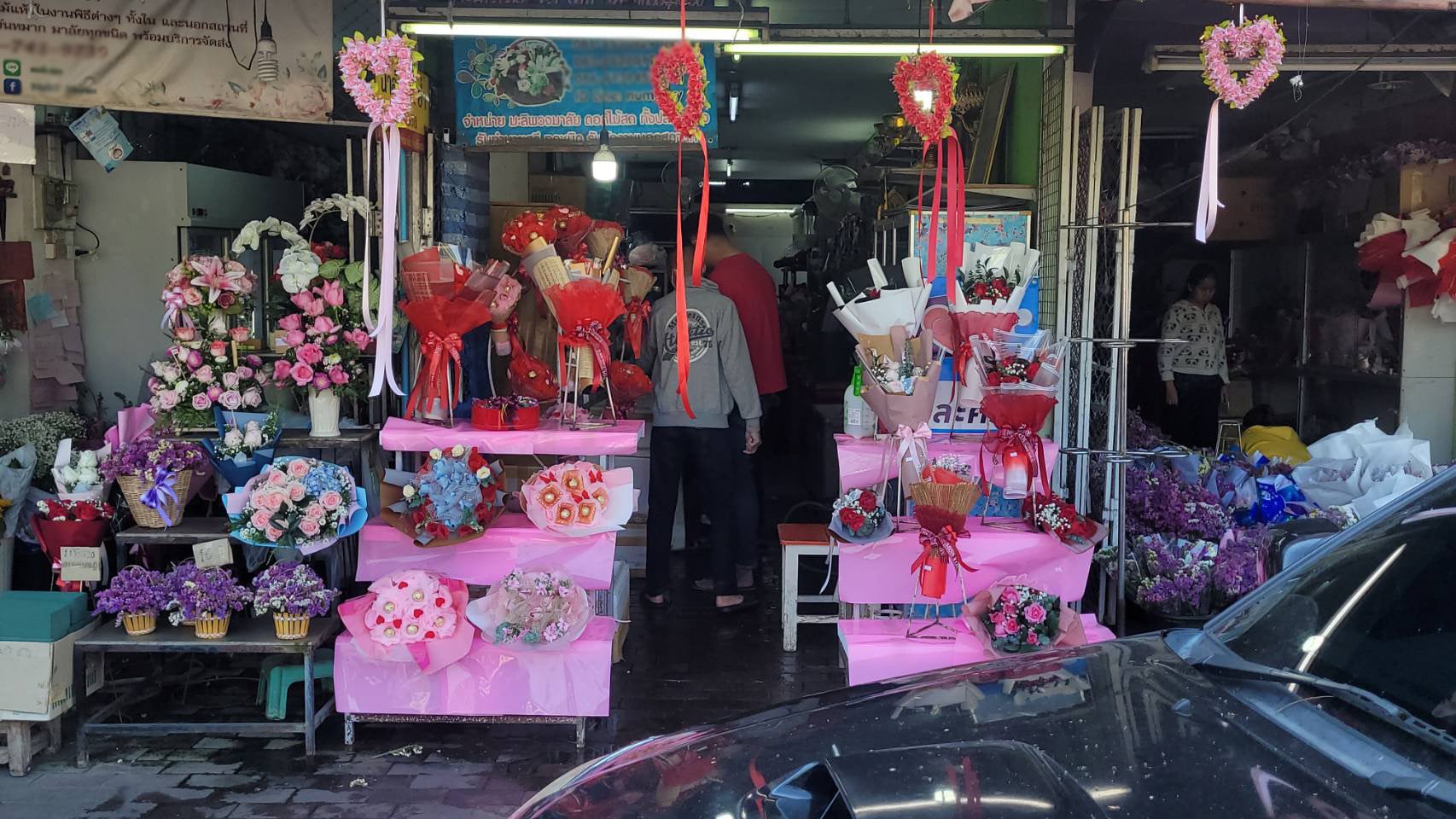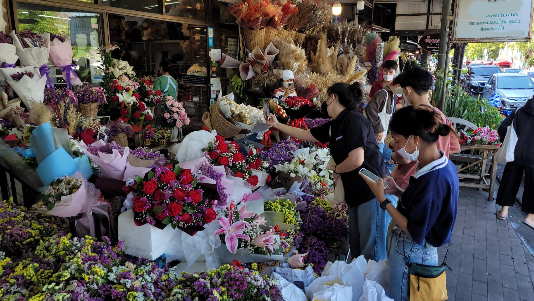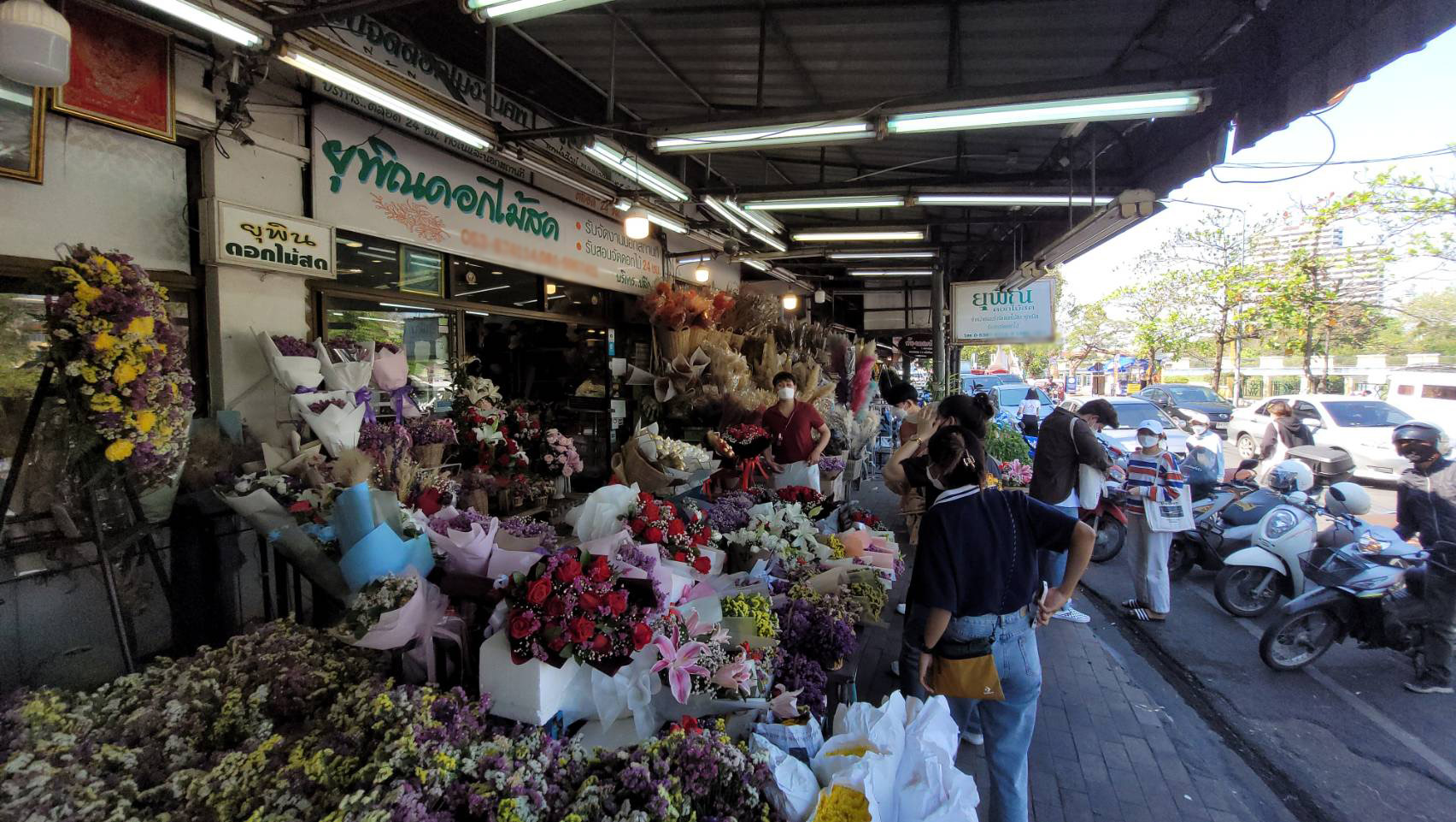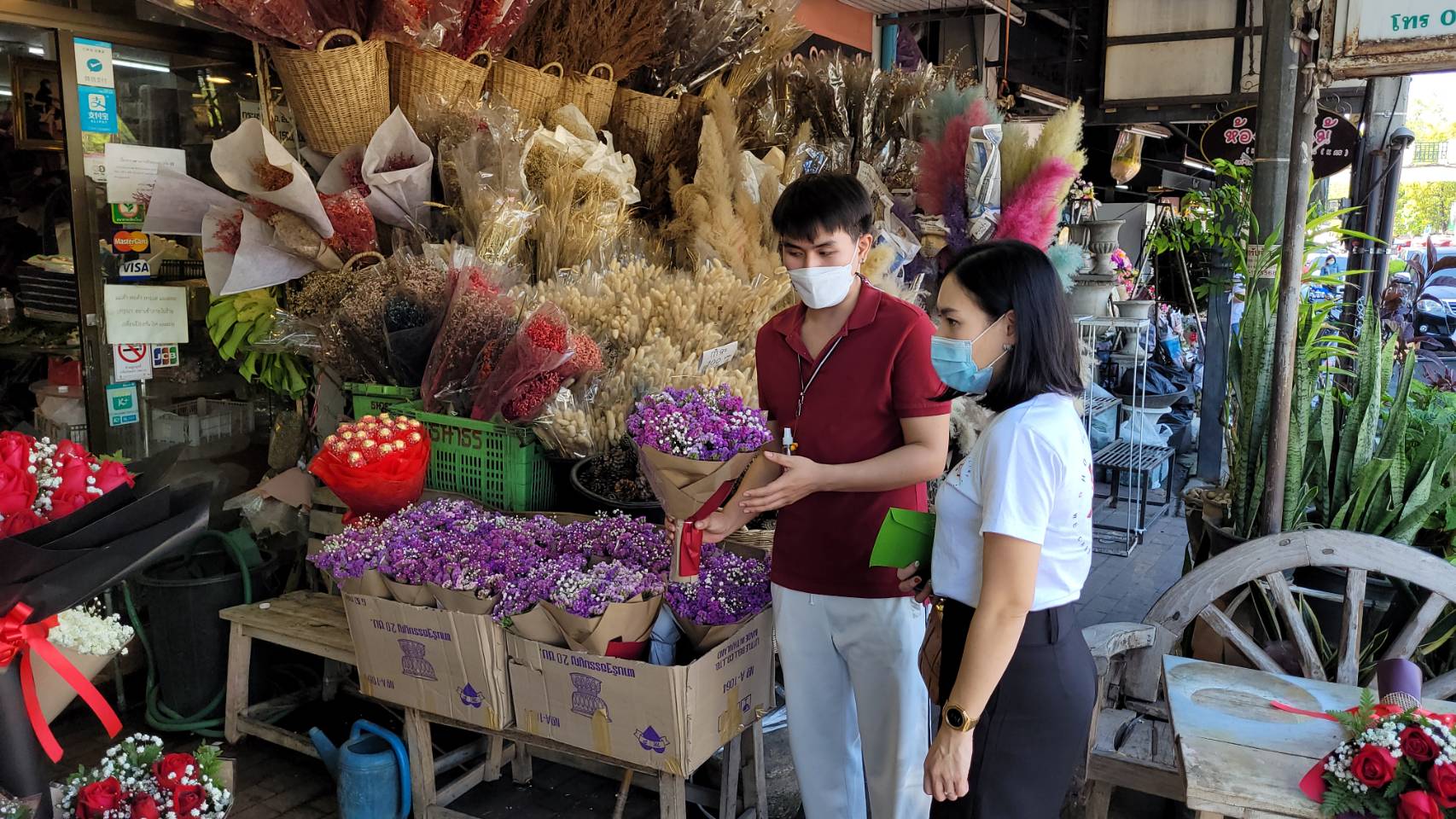 จากการสำรวจพบว่าร้านดอกไม้ต่างๆ ในย่านนี้ต่างมีการจัดตกแต่งร้านให้เข้ากับบรรยากาศในช่วงเทศกาลวาเลนไทน์ โดยได้มีการนำดอกกุหลาบสัญลักษณ์ของวันแห่งความรัก หลากสีสัน ตกแต่งเป็นข่อสวยงาม นำมาวางจำหน่ายทั้งในรูปแบบช่อหรือแบบดอกเดี่ยว หรือที่ตกแต่งด้วยดอกไม้พร้อมตุ๊กตา นอกจากนี้ ทางร้านก็ยังได้มีการเตรียมดอกกุหลาบไว้จำหน่ายอีกจำนวนมาก เพื่อรองรับความต้องการของลูกค้า ที่คาดว่าจะมีเพิ่มขึ้นมากในช่วง 13-14 ก.พ.นี้