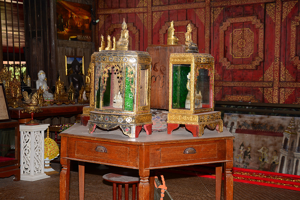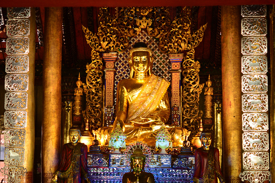 ภายในวิหารยกเป็น 3 ชั้น ชั้นสูงสุด คือชั้นพุทธะ (ชั้นของพระพุทธรูป) ชั้นต่อมาเป็นชั้นของสงฆ์ (อยู่บริเวณอาสนะ หน้าพระพุทธรูป) ชั้นสุดท้าย คือที่นั่งของ อุบาสก อุบาสิกา(ลดหลั่นลงมาตามระดับ) เสาในวิหารมีทั้งหมด 68 ต้น ลงรักปิดทอง 64 ต้น เพดานมีการลงลวดลายประดับด้วยกระจกสีที่งดงาม เป็นศิลปะแบบพม่ามัณฑะเลย์