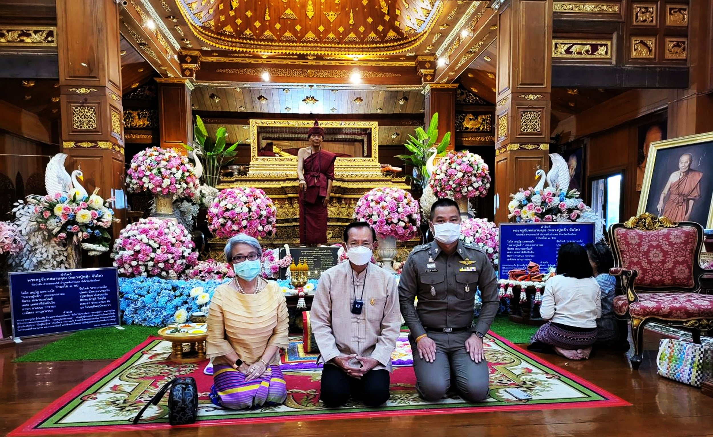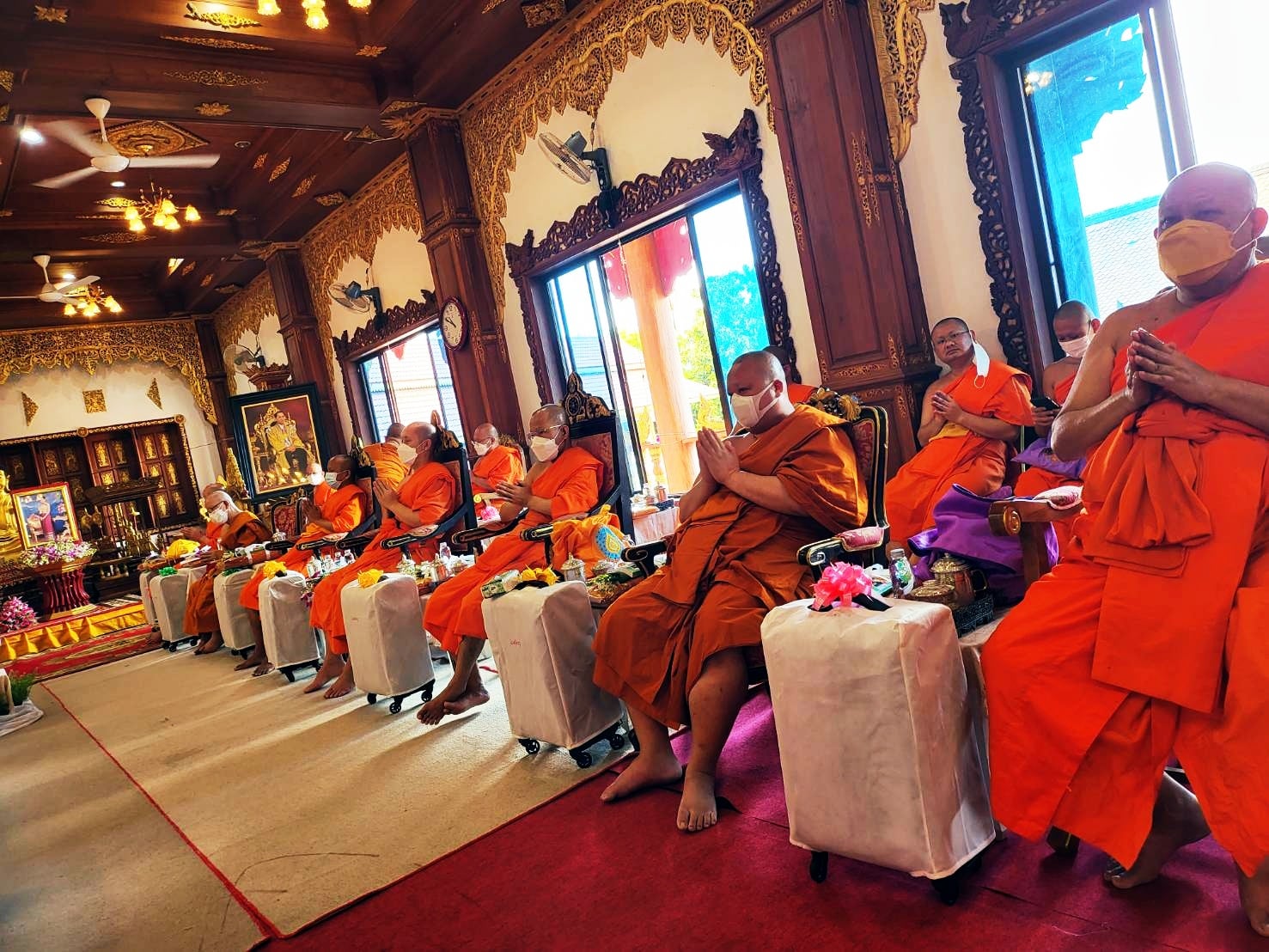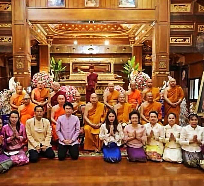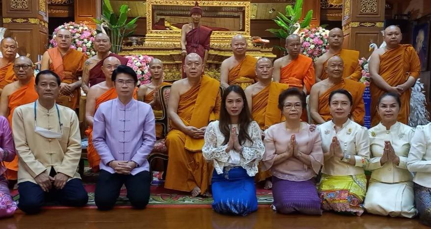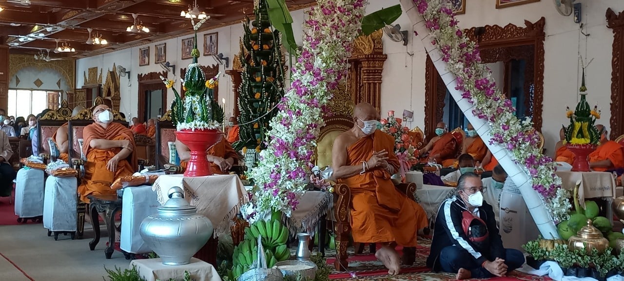โดยทางนายภิญโญ พัวศรีพันธ์ นายอำเภอสันกำแพง ประธานฝ่ายฆราวาส นายสมศักดิ์ วงศ์แก้วแปง นายกเทศมนตรีเทศบาลออนใต้ พร้อมผู้บริหาร และสามาชิก และ นายเพิ่มพูล ไชยสิทธิ์ ประธานชมรมกำนัน ผญบ.ต.ออนใต้ (เจ้าของพื้นที่) ได้ร่วมกันนิมนต์พระสงฆ์เจริญพุทธมนต์ 129 รูป เพื่อเป็นสิริมงคล พร้อมลูกศิษย์ร่วมพิธีเป็นจำนวนมาก มีทาง พ.ต.อ.ณัฐพล จันมะโน ผกก.สันกำแพง ดร.ถวิล บัวจีน เจ้าของและผู้จัดการศูนย์อุสาหกกรมทำร่มบ้านบ่อสร้าง และมีศรัทธาสาธุชนลูกศิษย์ร่วมพิธีบนกุฏิไม้สักทองใหญ่