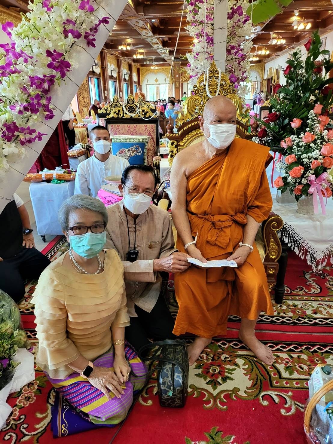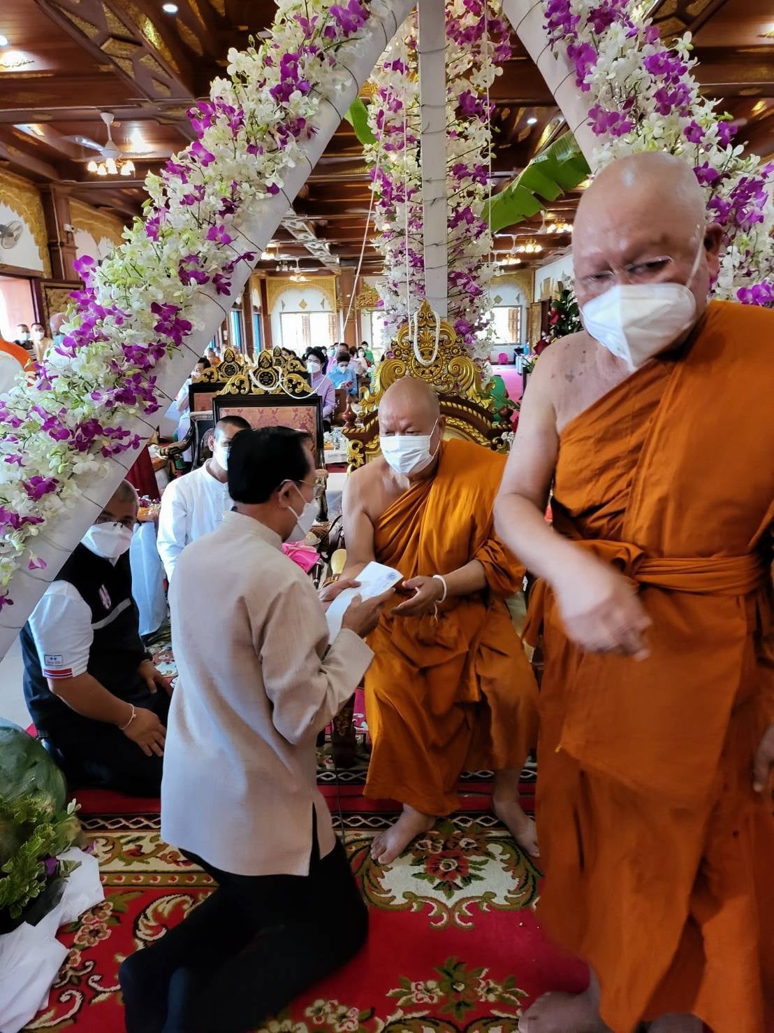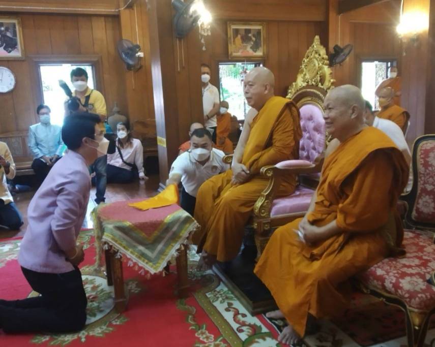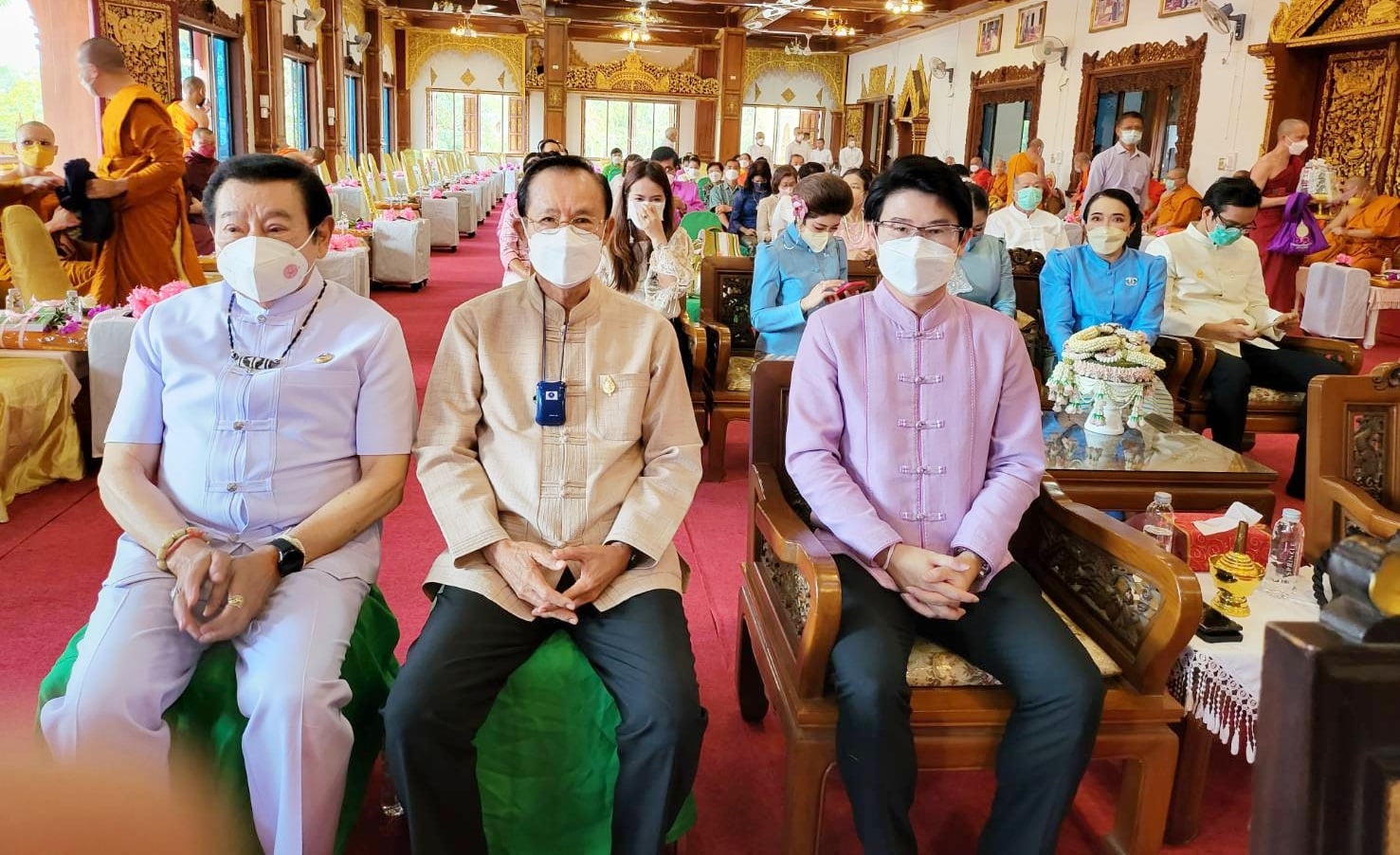 โดยทางนายภิญโญ พัวศรีพันธ์ นายอำเภอสันกำแพง ประธานฝ่ายฆราวาส นายสมศักดิ์ วงศ์แก้วแปง นายกเทศมนตรีเทศบาลออนใต้ พร้อมผู้บริหาร และสามาชิก และ นายเพิ่มพูล ไชยสิทธิ์ ประธานชมรมกำนัน ผญบ.ต.ออนใต้ (เจ้าของพื้นที่) ได้ร่วมกันนิมนต์พระสงฆ์เจริญพุทธมนต์ 129 รูป เพื่อเป็นสิริมงคล พร้อมลูกศิษย์ร่วมพิธีเป็นจำนวนมาก มีทาง พ.ต.อ.ณัฐพล จันมะโน ผกก.สันกำแพง ดร.ถวิล บัวจีน เจ้าของและผู้จัดการศูนย์อุสาหกกรมทำร่มบ้านบ่อสร้าง และมีศรัทธาสาธุชนลูกศิษย์ร่วมพิธีบนกุฏิไม้สักทองใหญ่