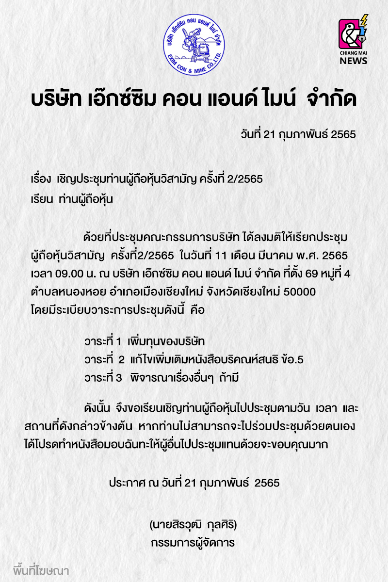ผู้ถือหุ้นวิสามัญ ครั้งที่2/2565 ในวันที่ 11 เดือน มีนาคม พ.ศ. 2565
