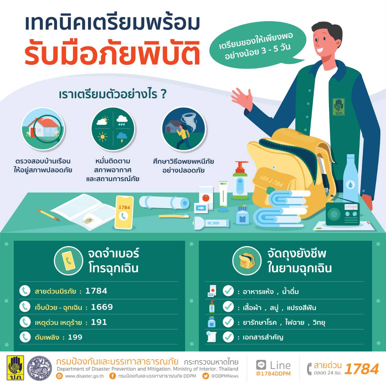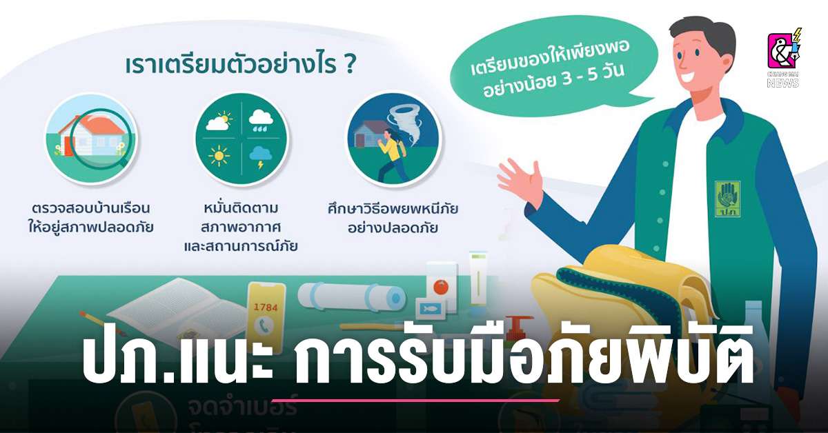 ปภ.แนะเตรียมพร้อม รู้รับ ปรับตัว ปลอดภัยจากภัยพิบัติ ภัยพิบัติมีแนวโน้มเกิดขึ้นบ่อยครั้ง การเตรียมความพร้อมรับมือภัยพิบัติล่วงหน้า จะช่วยให้ดำเนินชีวิตท่ามกลางสถานการณ์ภัยได้อย่างปลอดภัย เพื่อความปลอดภัย กระทรวงมหาดไทย โดยกรมป้องกันและบรรเทาสาธารณภัย (ปภ.) ขอแนะข้อควรปฏิบัติในการเตรียมพร้อมรับมือภัยพิบัติ ดังนี้