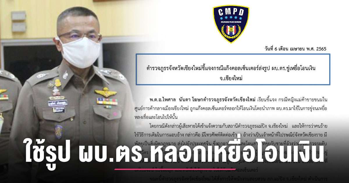 วันที่ 6 เดือน เมษายน พ.ศ. 2565 ตำรวจภูธรจังหวัดเชียงใหม่ชี้แจงกรณีแก๊งคอลเซ็นเตอร์ส่งรูป ผบ.ตร.ขู่เหยื่อโอนเงิน จ.เชียงใหม่ พ.ต.อ.ไพศาล นันตา โฆษกตำรวจภูธรจังหวัดเชียงใหม่ เรียนชี้แจง กรณีหญิงแม่ค้าขายขนมในศูนย์การค้ากลางเมืองเชียงใหม่ ถูกแก๊งคอลเซ็นเตอร์หลอกให้โอนเงินโดยนำภาพ ผบ.ตร.มาใช้ในการขู่จนเหยื่อหลงเชื่อและโอนไปให้นั้น